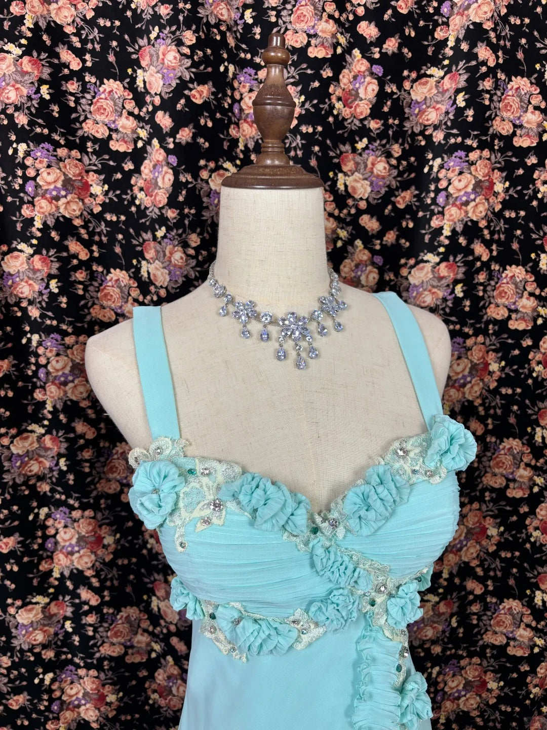 Gorgeous Spaghetti Strap Sheath Evening Gowns Ruffles Slit Appliques Beaded Prom Dress AP2537