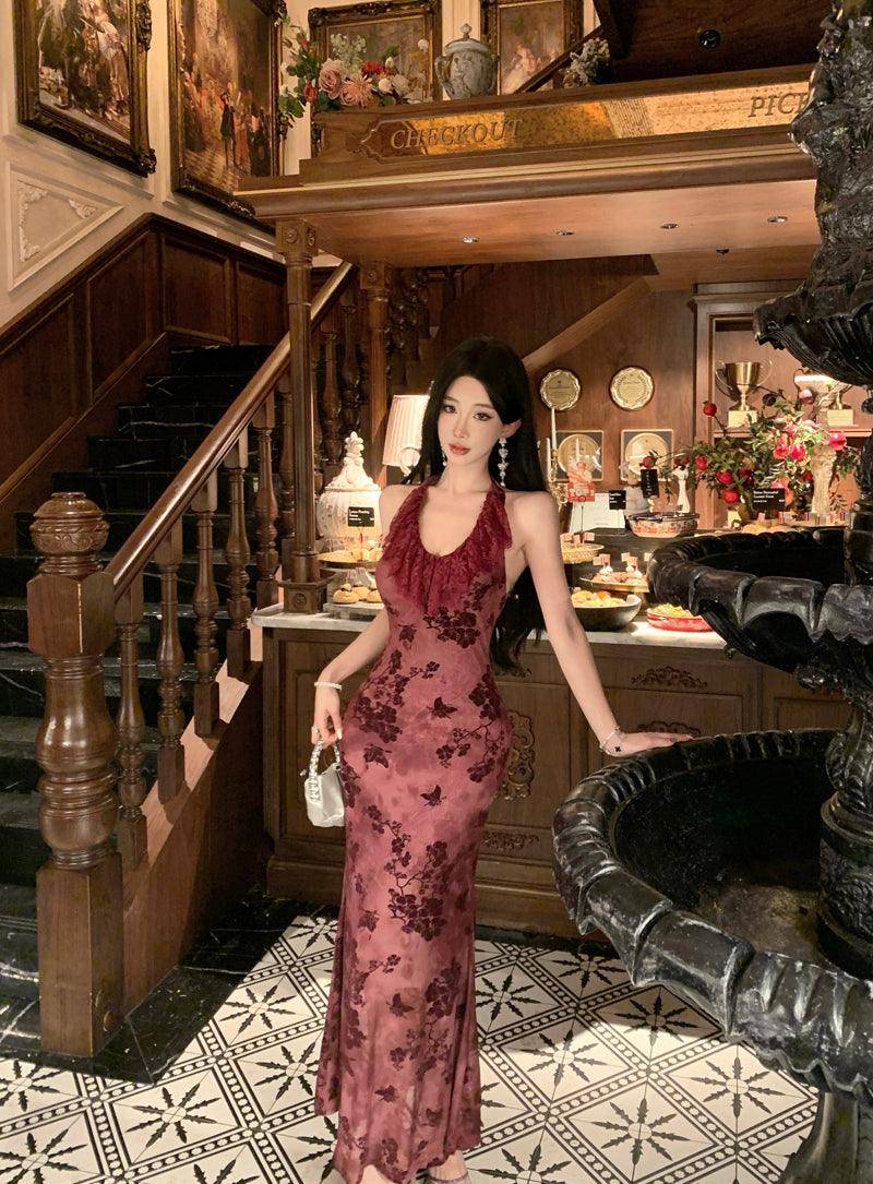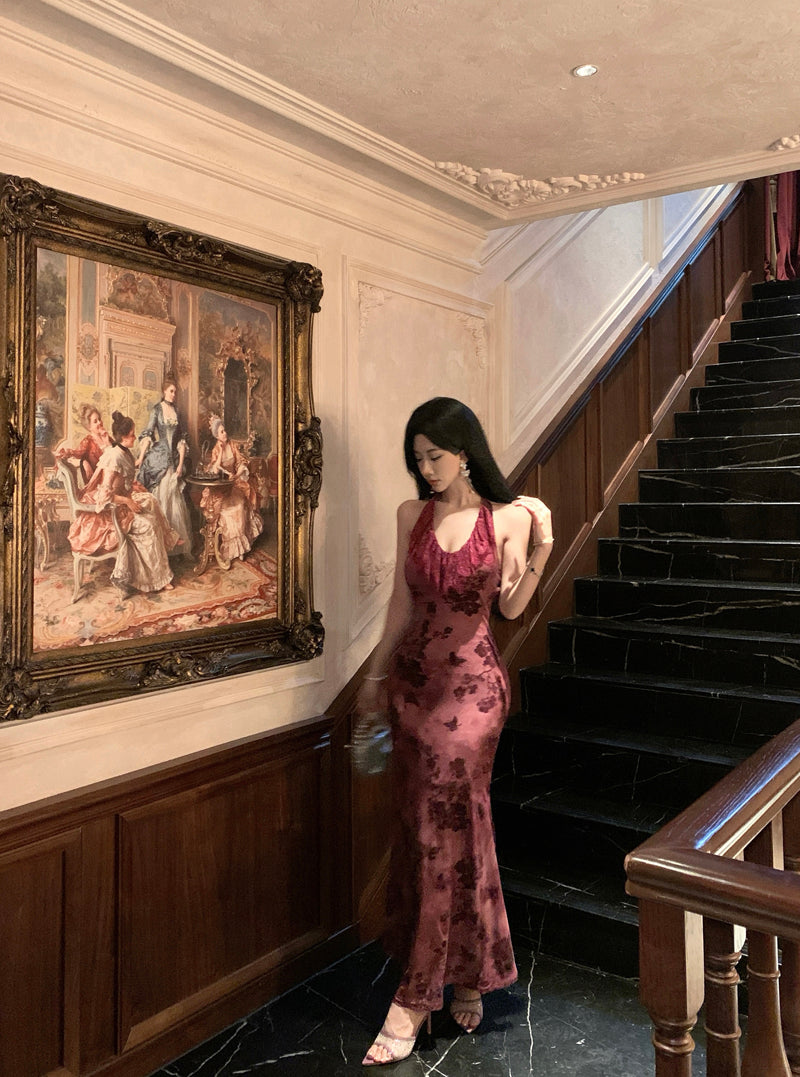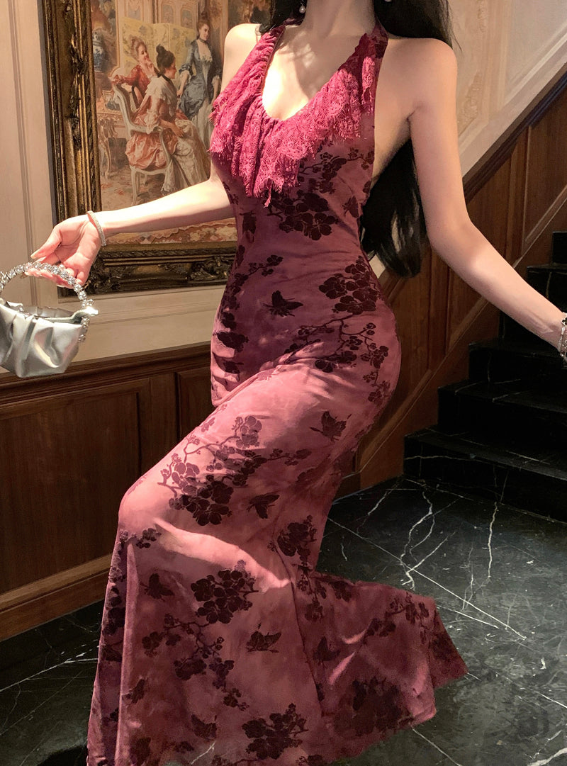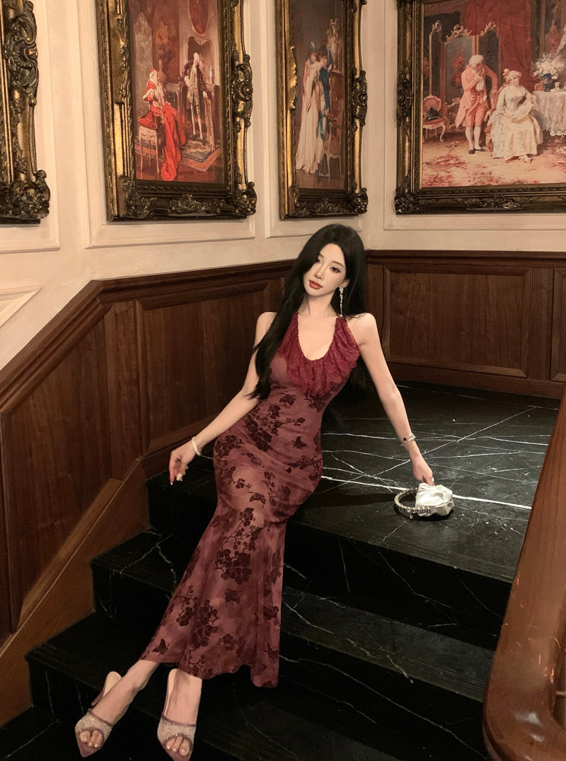 Refined Backless Mermaid Lace Trimmed Evening Maxi Dress Vintage Jacquard Cinched-Waist Halter Long Dress AP3469