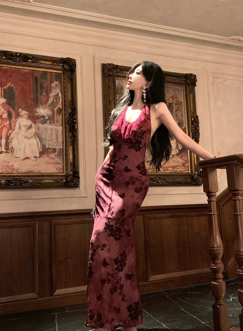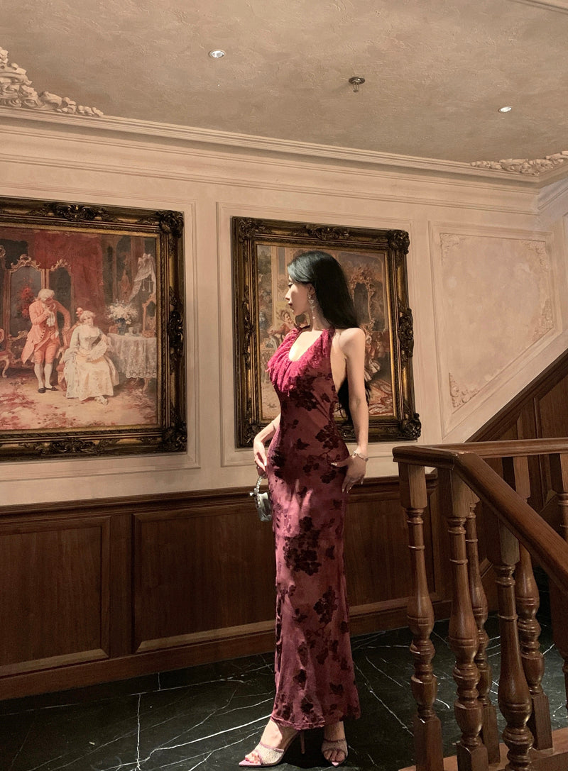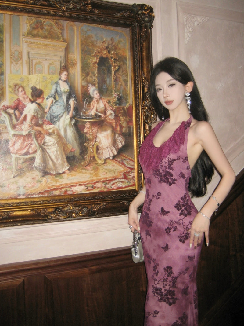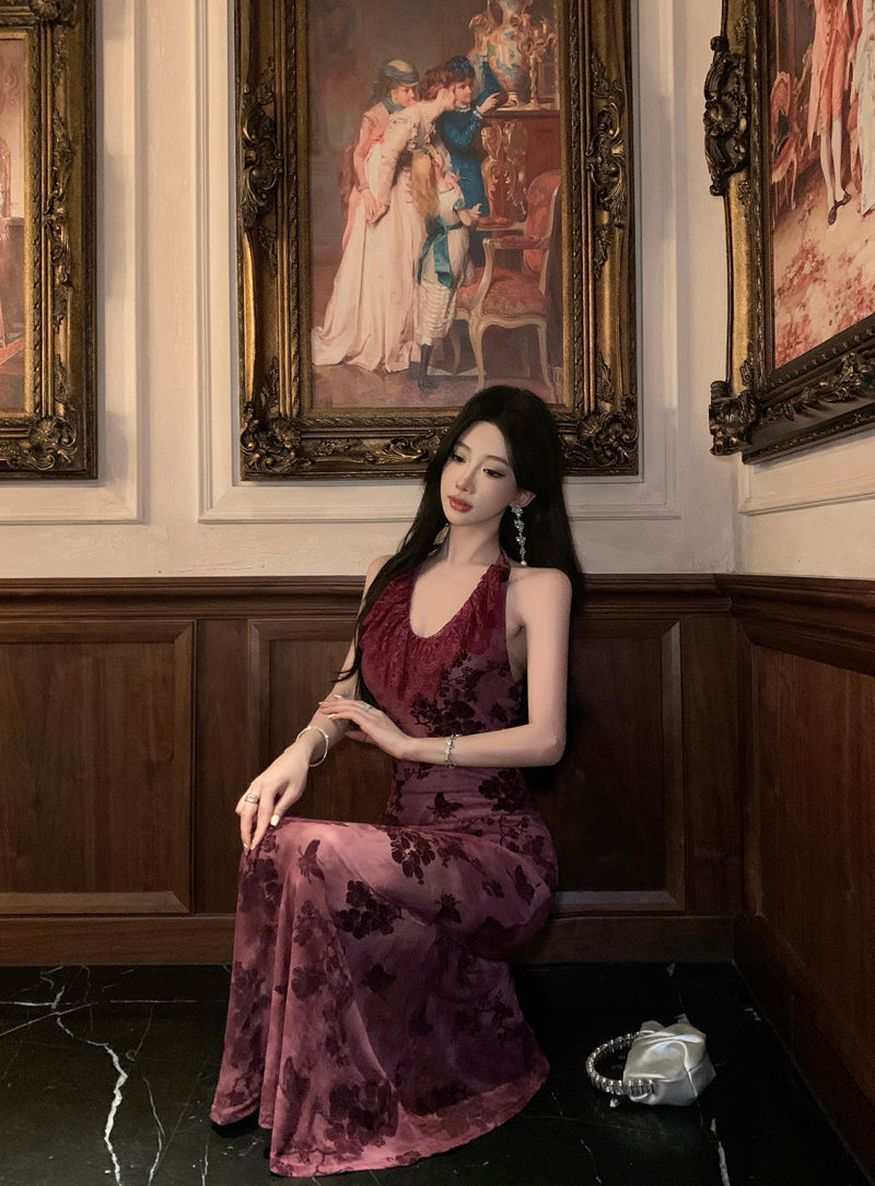 Refined Backless Mermaid Lace Trimmed Evening Maxi Dress Vintage Jacquard Cinched-Waist Halter Long Dress AP3469