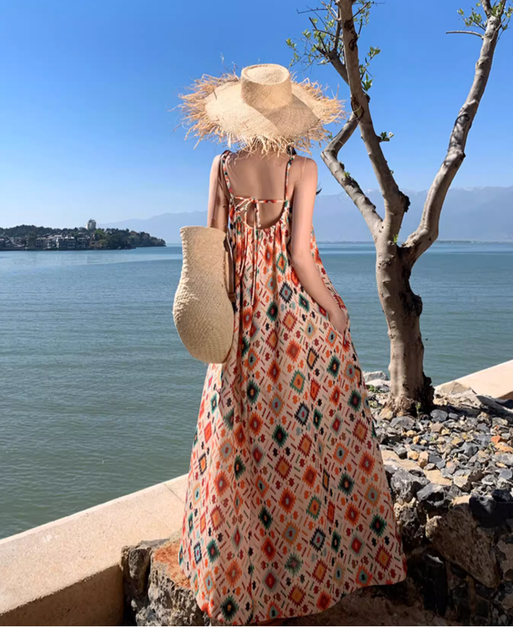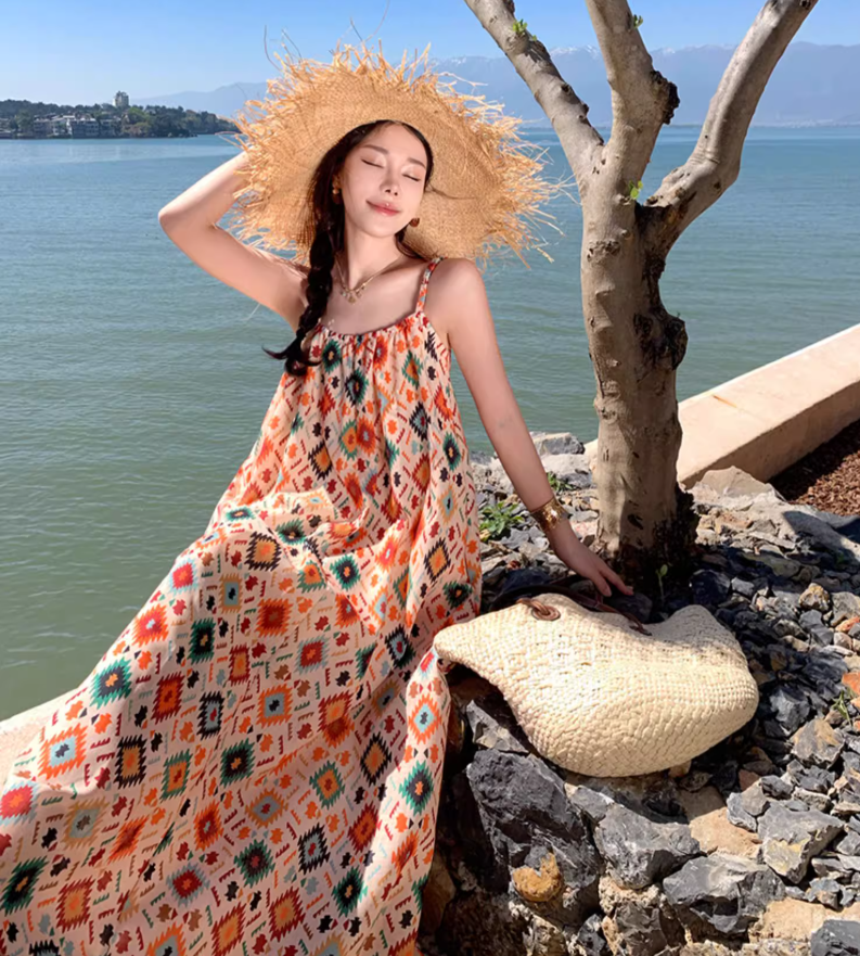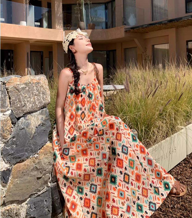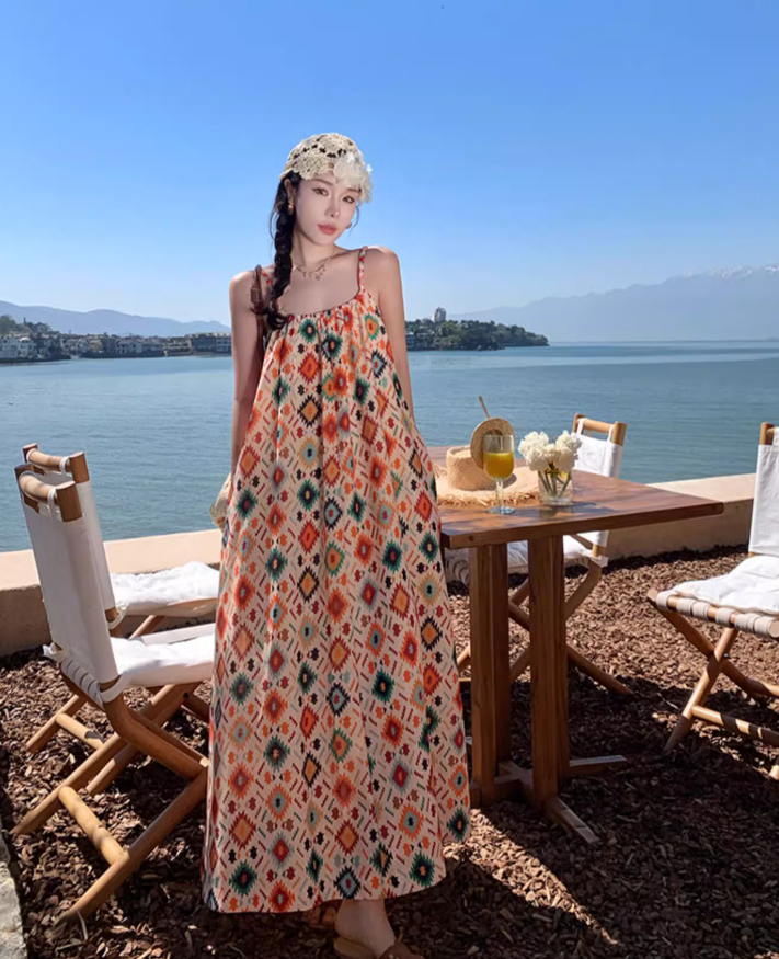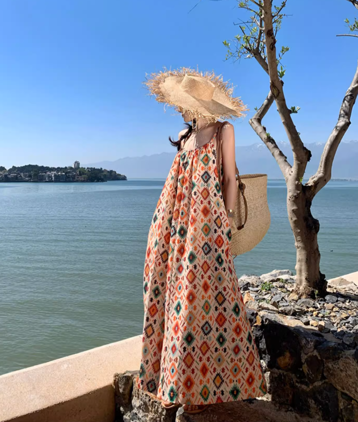 Boho Style Designer Vintage Maxi Dress Island Photo Oversize Long Dress AP0601