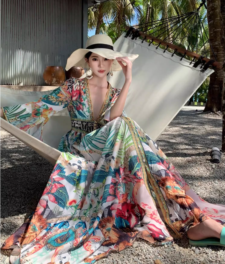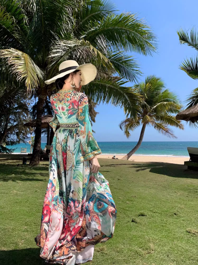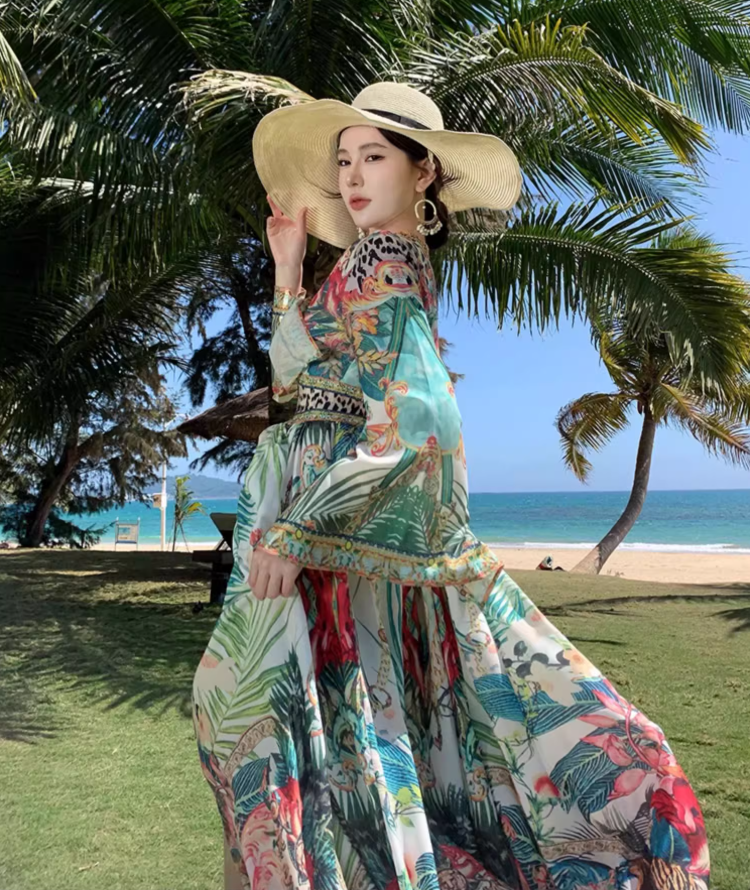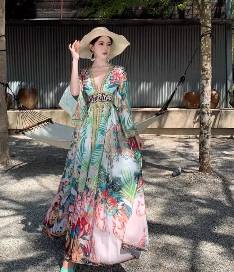 Boho-Chic V Neck Flowy Maxi Dres Exotic Ambience Long Sleeve Ethereal Long Dress AP0621