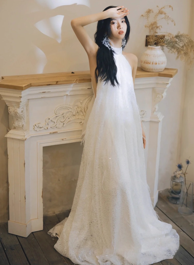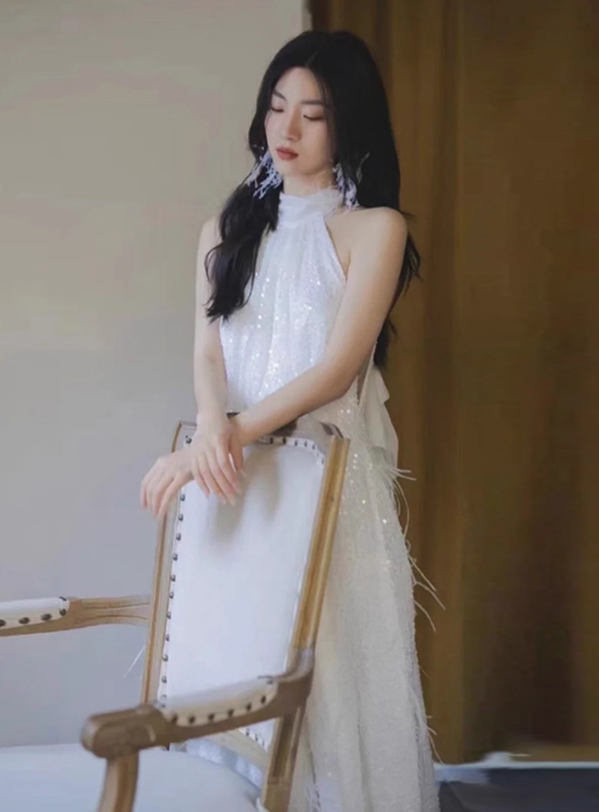 Ethereal Sparkly Sequins Evening Dress Minimalist Backless Double Layers Halter Prom Dress AP0940