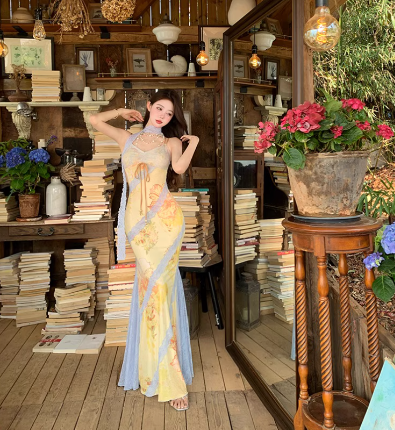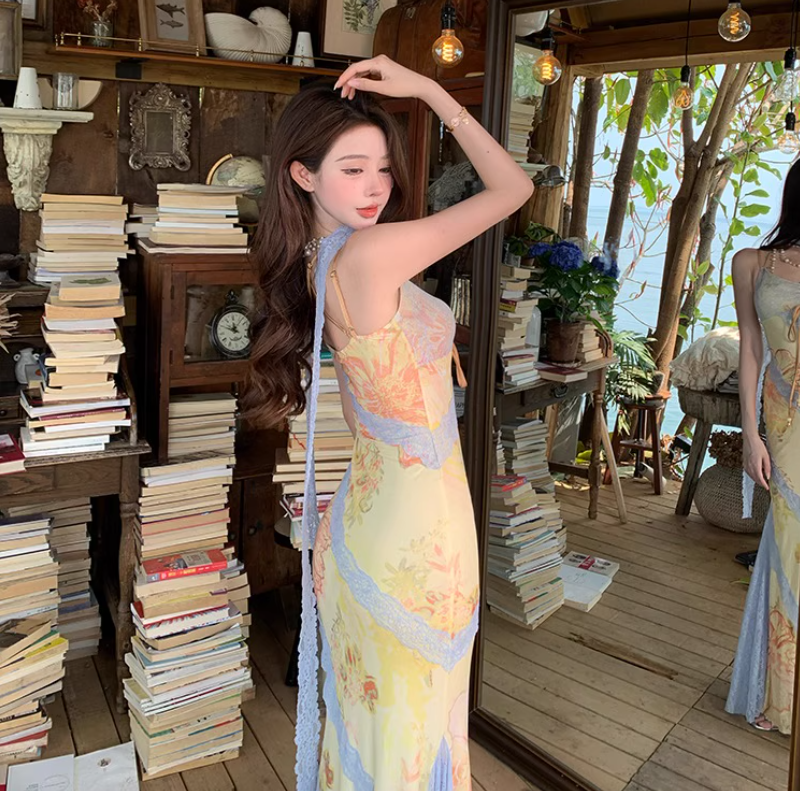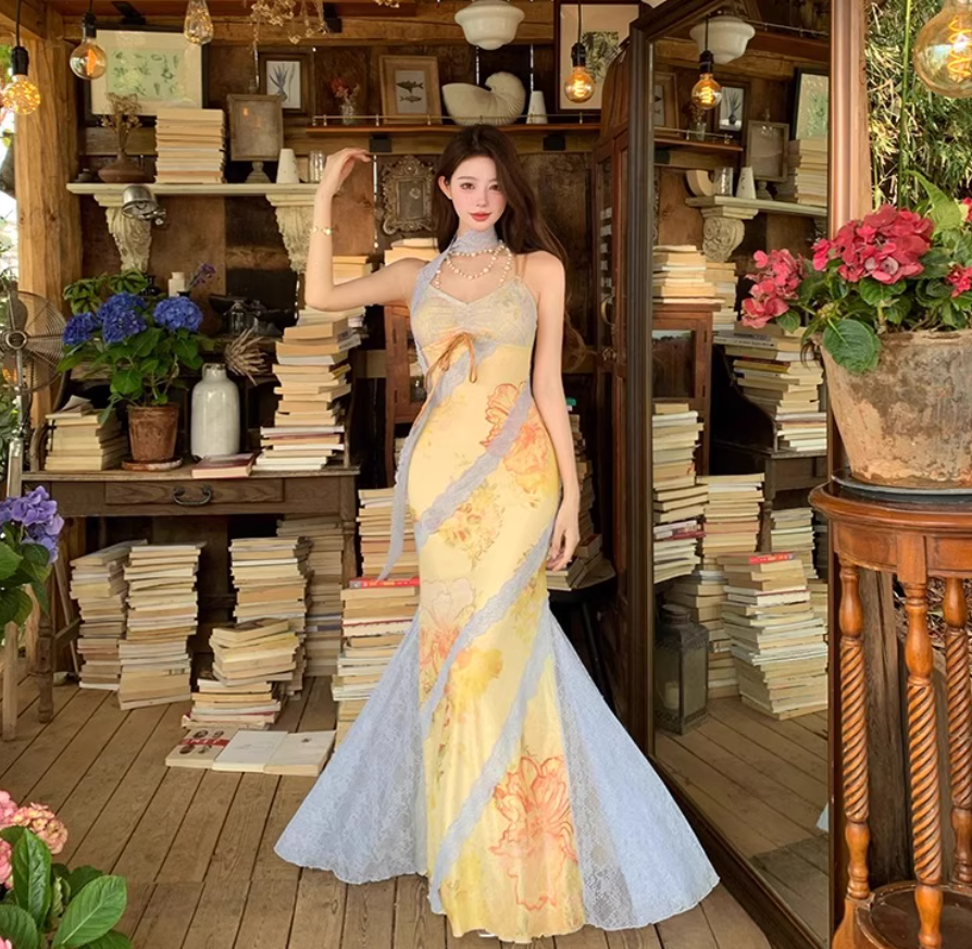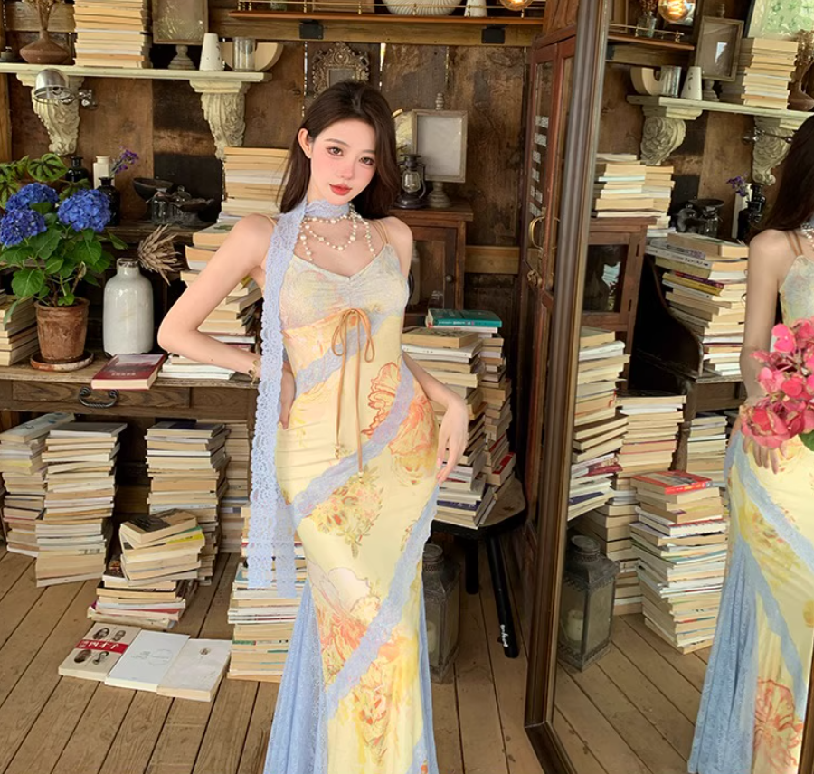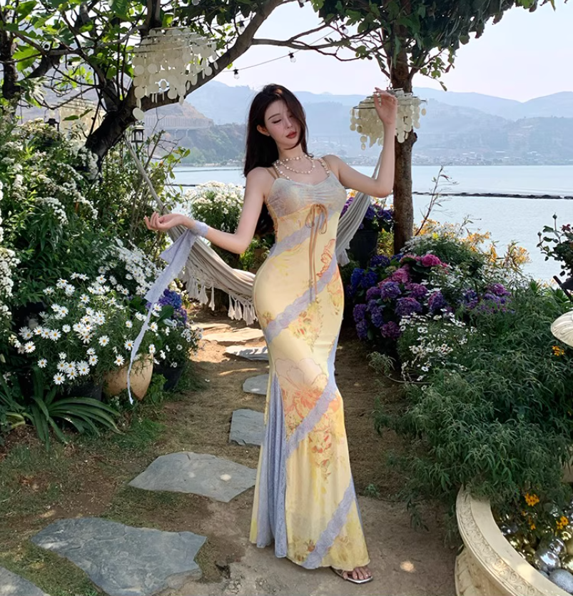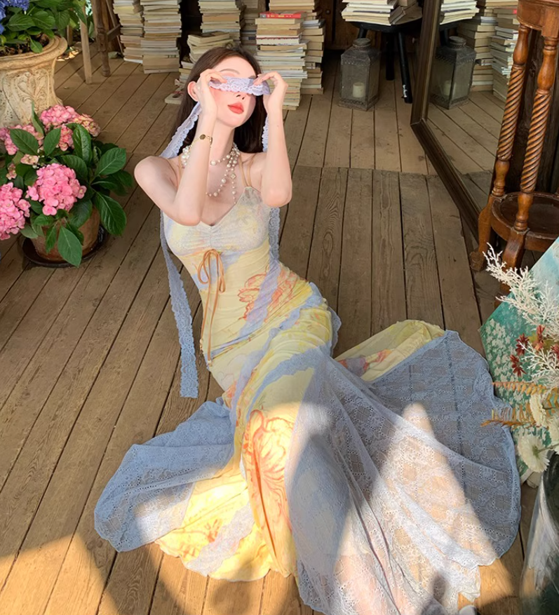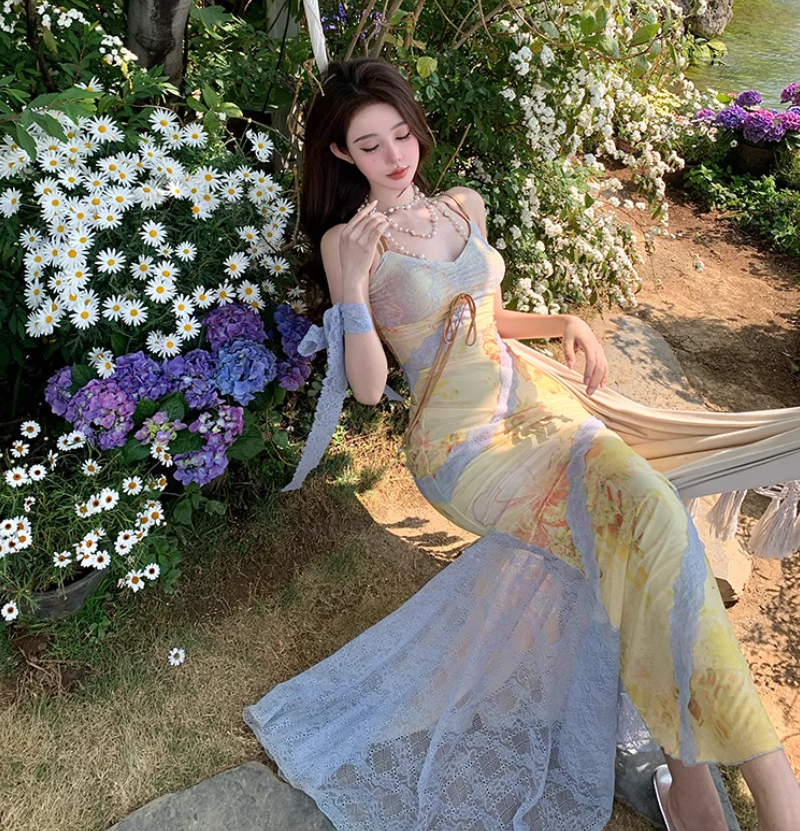 Summer Vacation Mermaid Dress Lace-Trimmed Spaghetti Strap Party Bodycon Long Dress AP0347