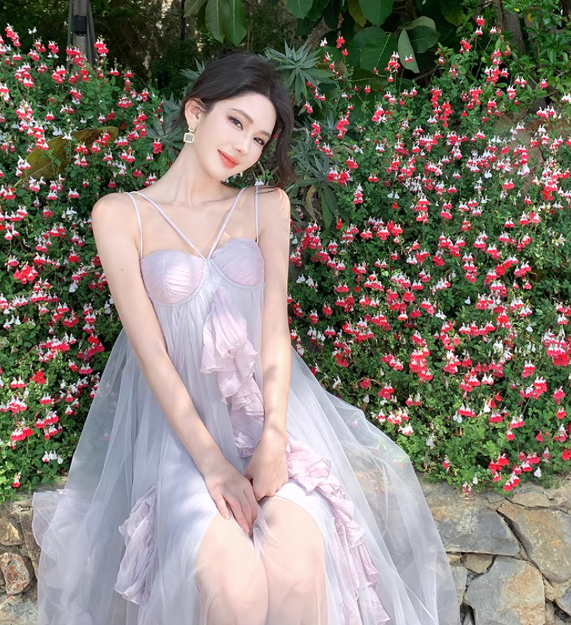 Double Layer Flowy Party Oversize Ruffled Dress Voile Trimmed Spaghetti Strap Long Dress AP0348