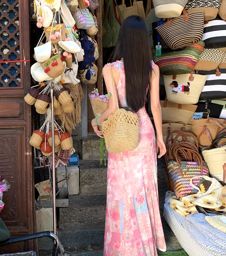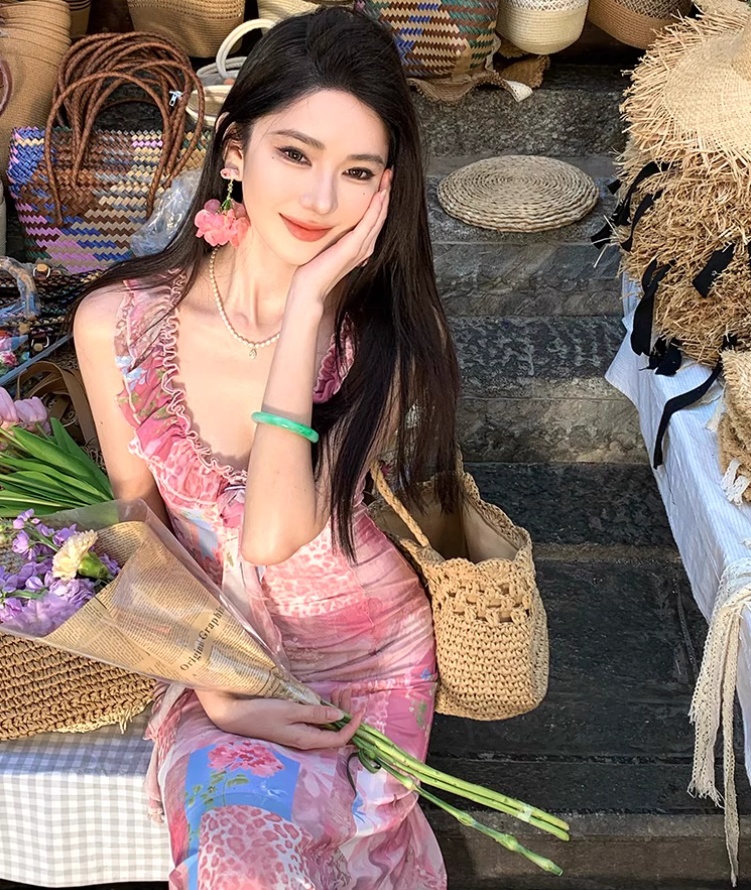 Floral print Elegant Vacation Dress Ruffles Neck Strap Summer A-Line Long Dress AP0349