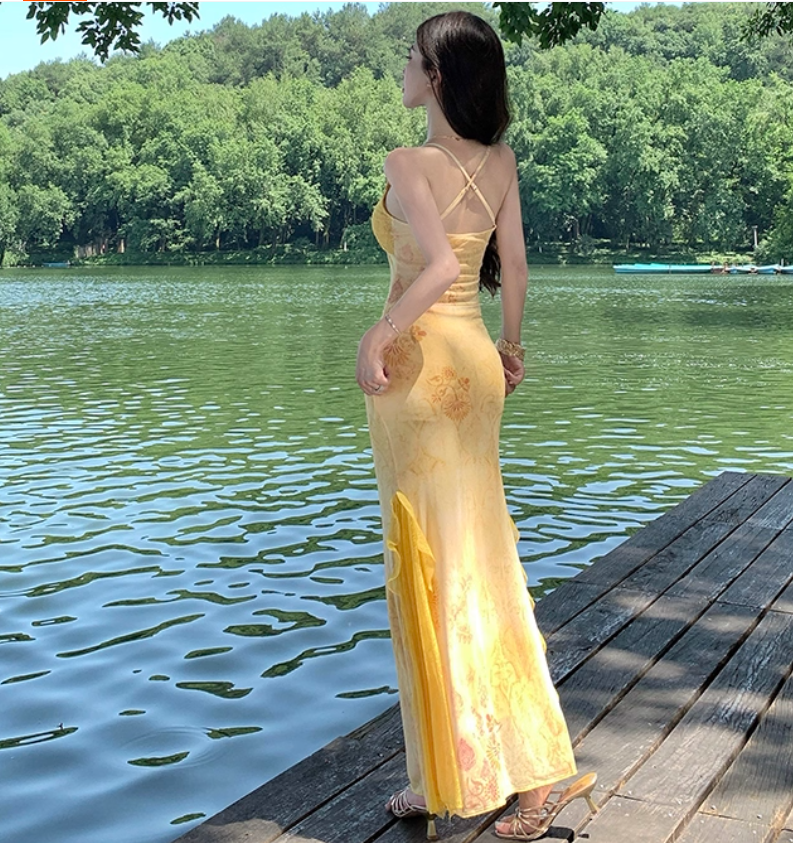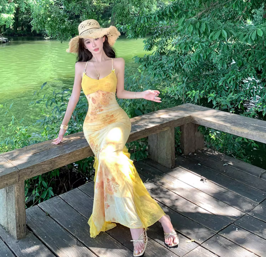 Summer Vacation Floral Print Bodycon Mermaid Dress Spaghetti Strap Photo Ready Long Dress AP0423