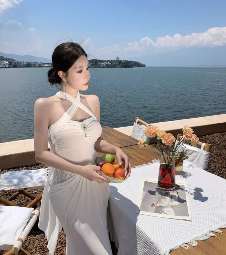 Lace Patchwork Strapless Draped Sundress Soft Fabric Bodycon Long Dress AP0602