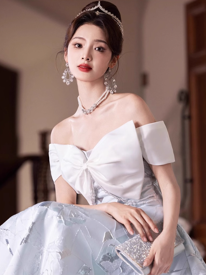 Off-Shoulder Bow-Knot Beading Evening Gowns Backless Sheen Fabric A-line Prom Dress AP0652