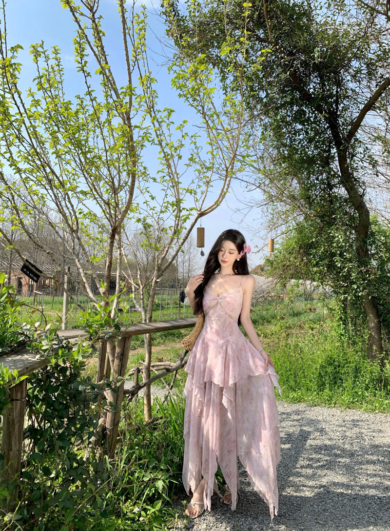French-Inspired Spaghetti Strap A-Line Maxi Dress Dopamine Style Floral Print Asymmetric Hem Lace Trim Long Dress AP3319