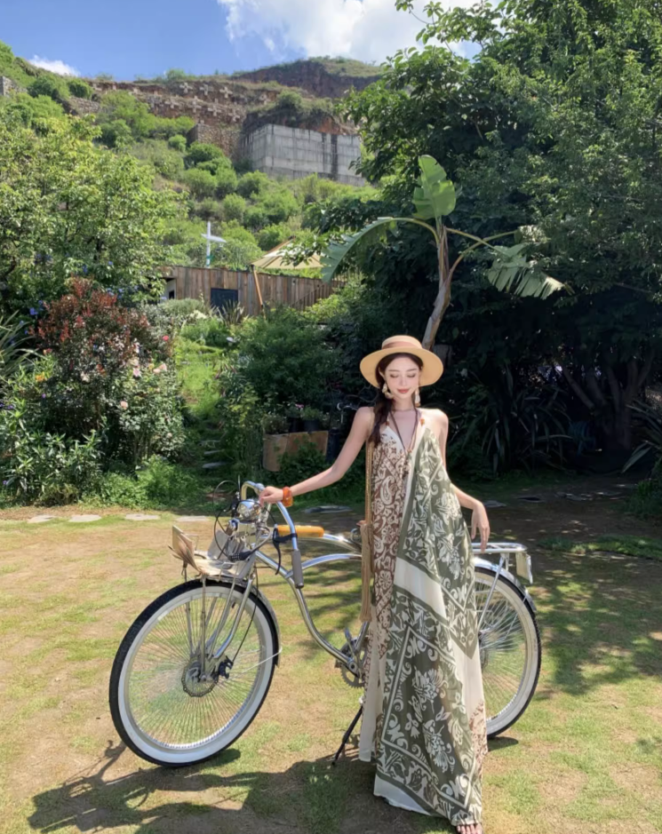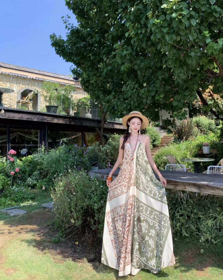 Boho Style Earthy Tone Tribal Pattern Getaways Maxi Dress V-Neck Flowy Halter Dress AP1120