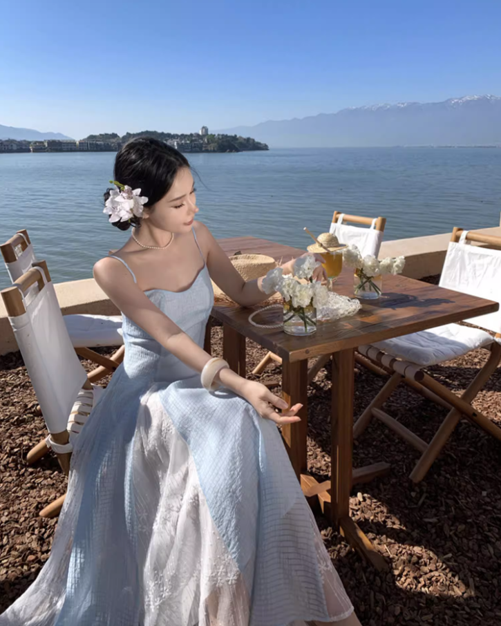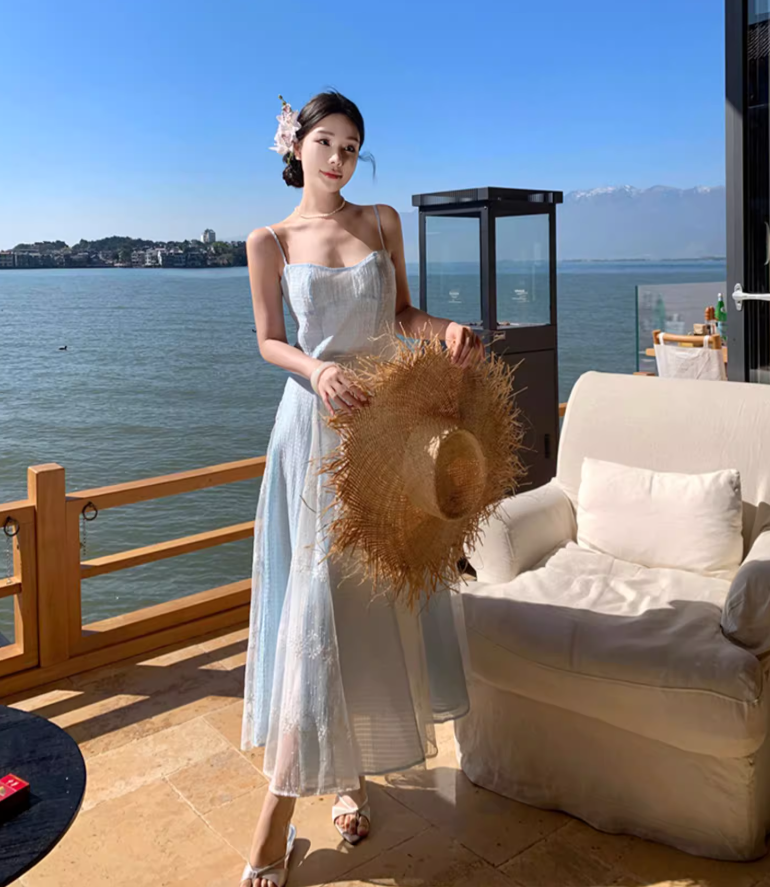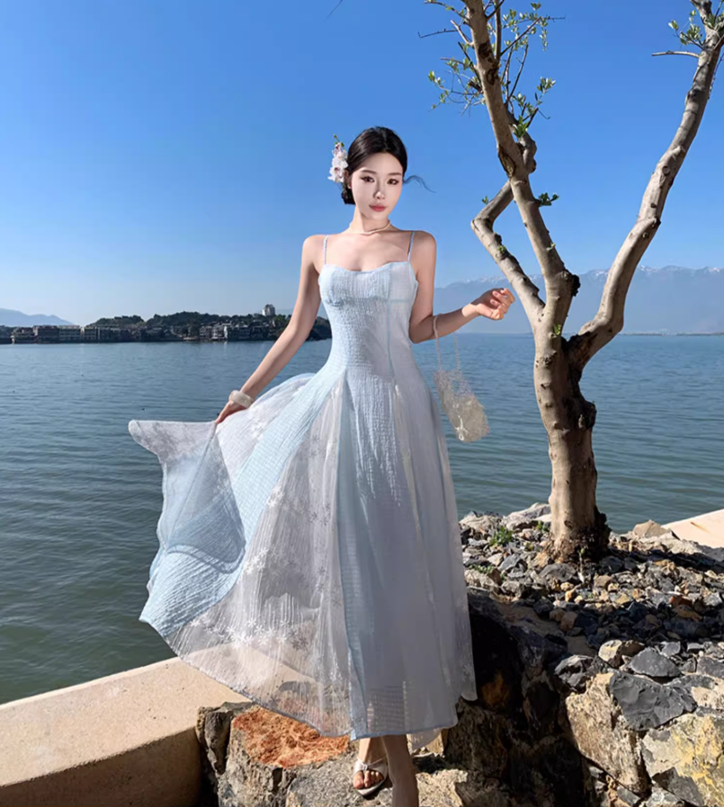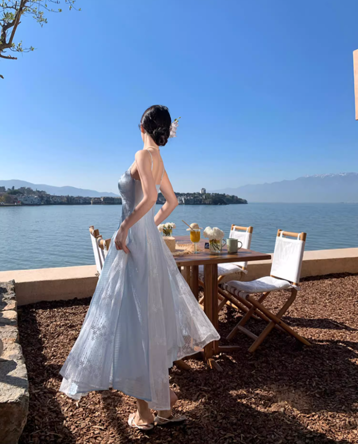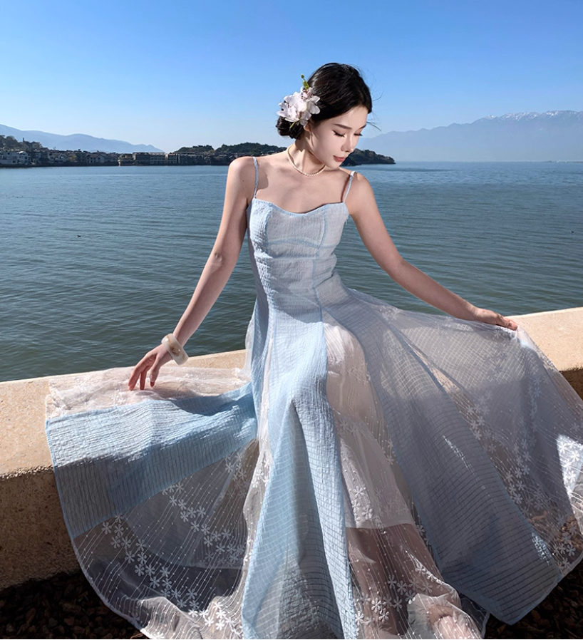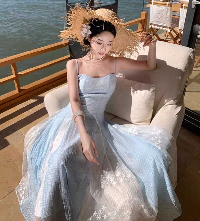 Ethereal Blue & White Splicing Textured Floral Spaghetti Strap Maxi Dress Natural Trips Cinched-Waist Flowy Long Dress AP1610