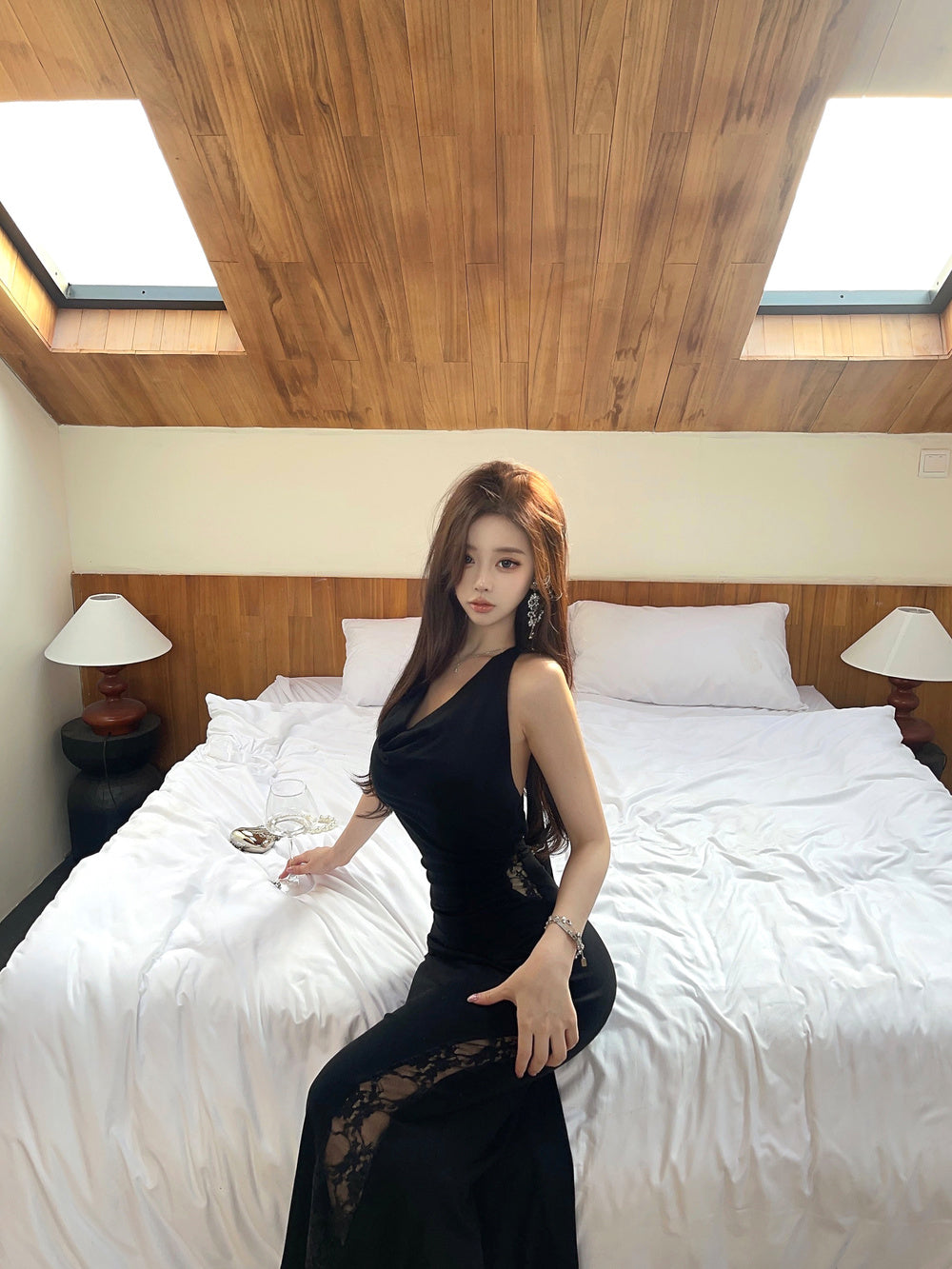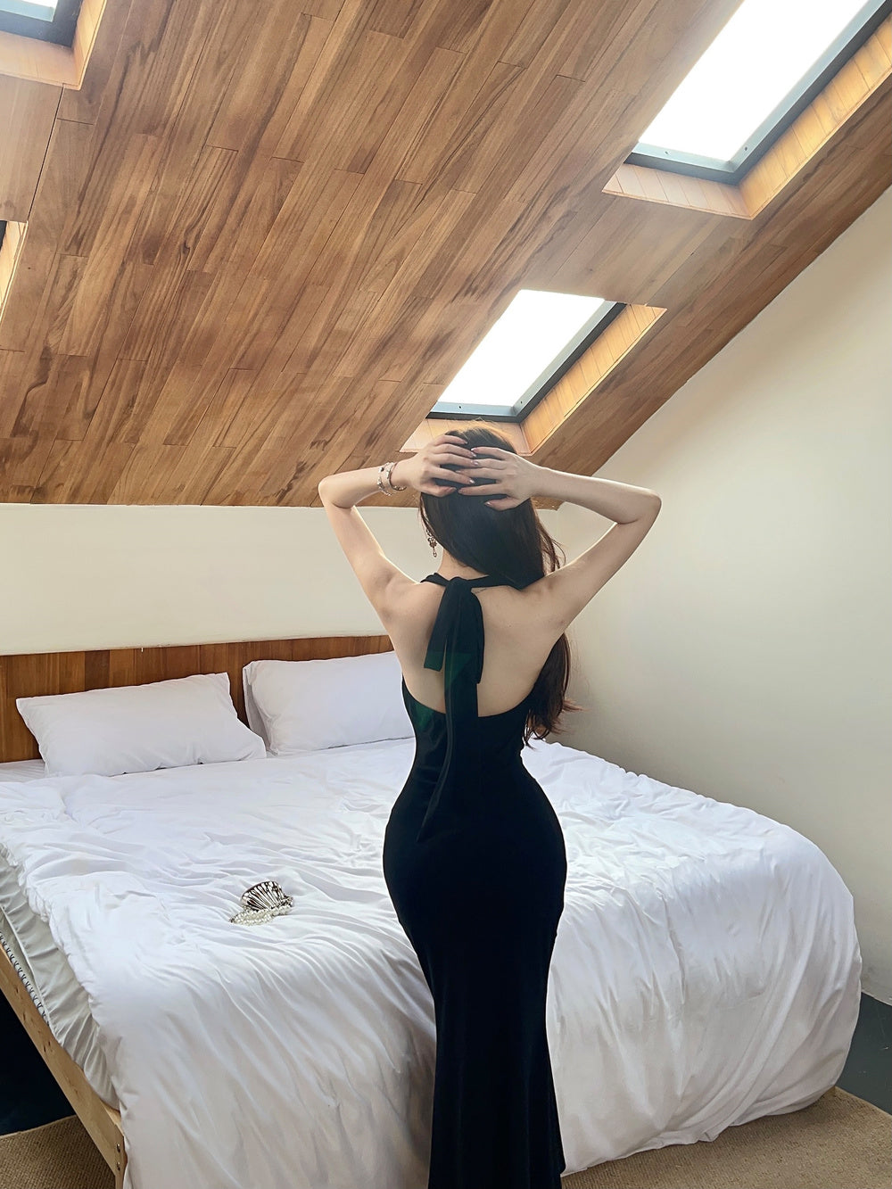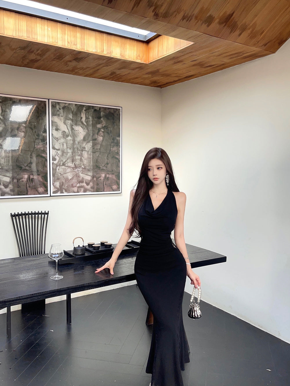 Sexy Lady Black Backless Cowl Neck Mermaid Maxi Dress Vogue Lace Splicing Halter Long Dress AP2047