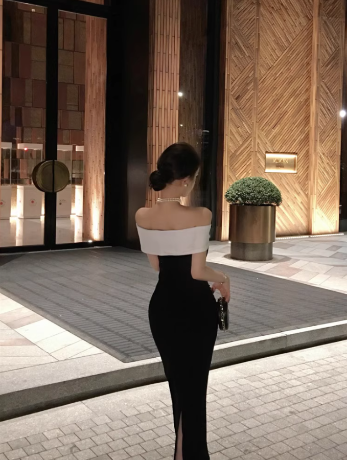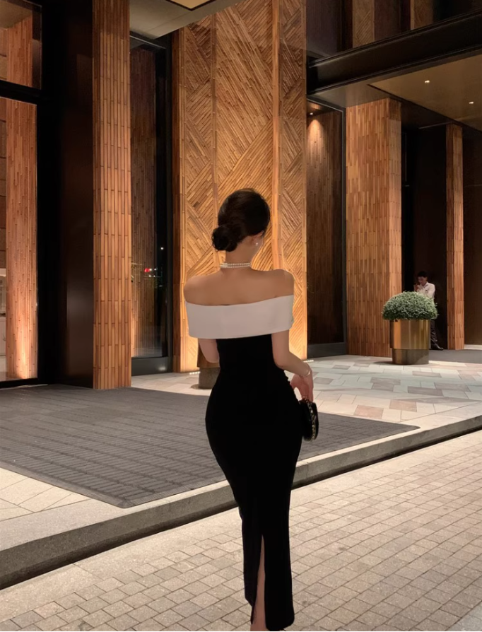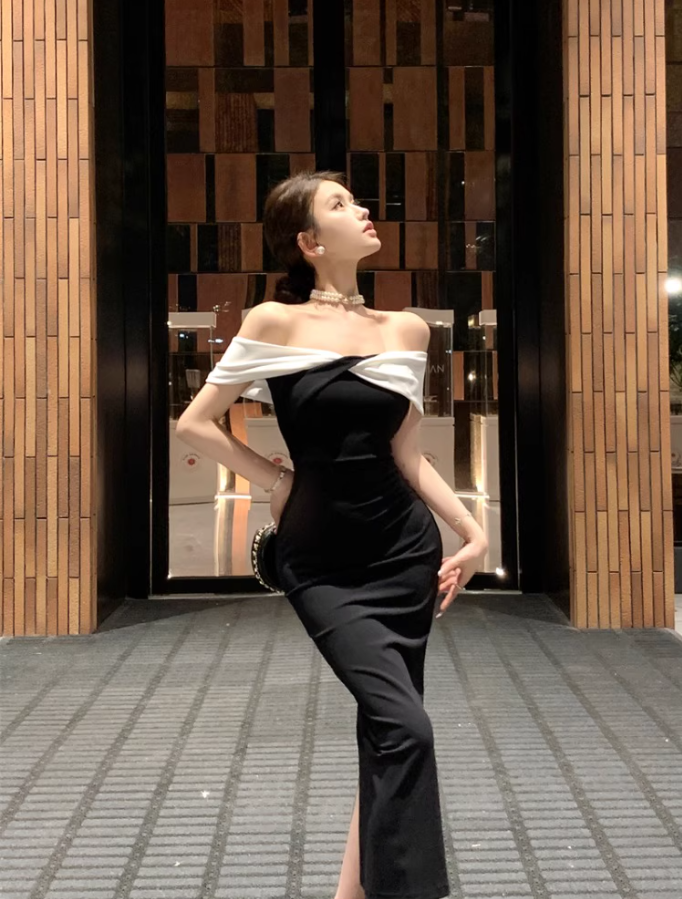 Alluring Black Sheath Mermaid Maxi Dress Sexy Stylish Shoots White Off-Shoulder Slit Long Dress AP1511