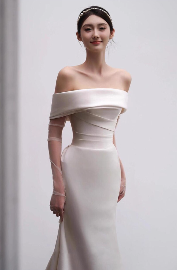 Glamorous Satin Fabric Sheer Sleeves Bridal Dress Off-Shoulder Strapless Wedding Dress AP0858
