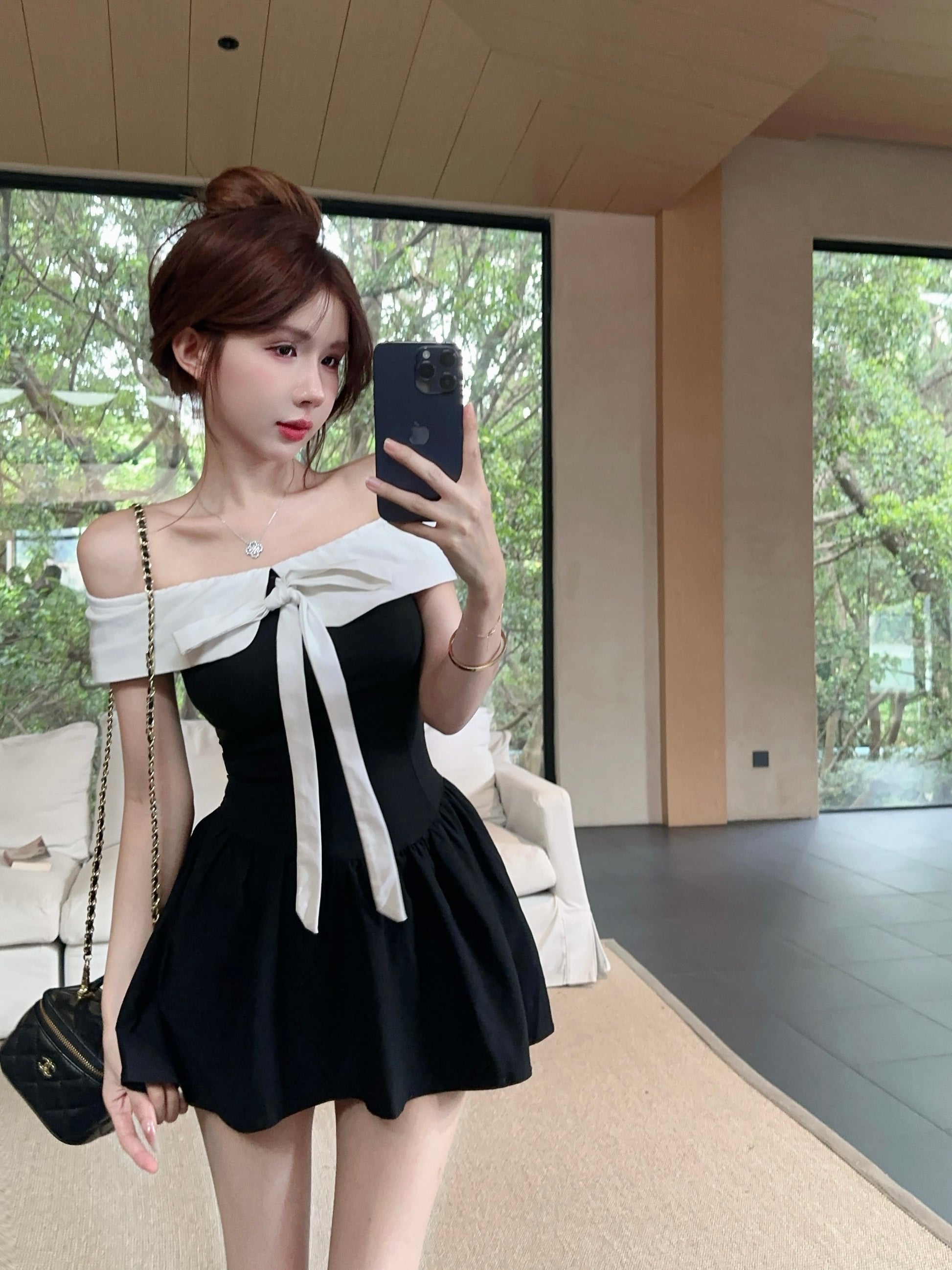 Trendy Large Bow Detail Off-Shoulder Mini Dress Cute Fitted Bodice Black & White Color-Block Short Dress AP1888