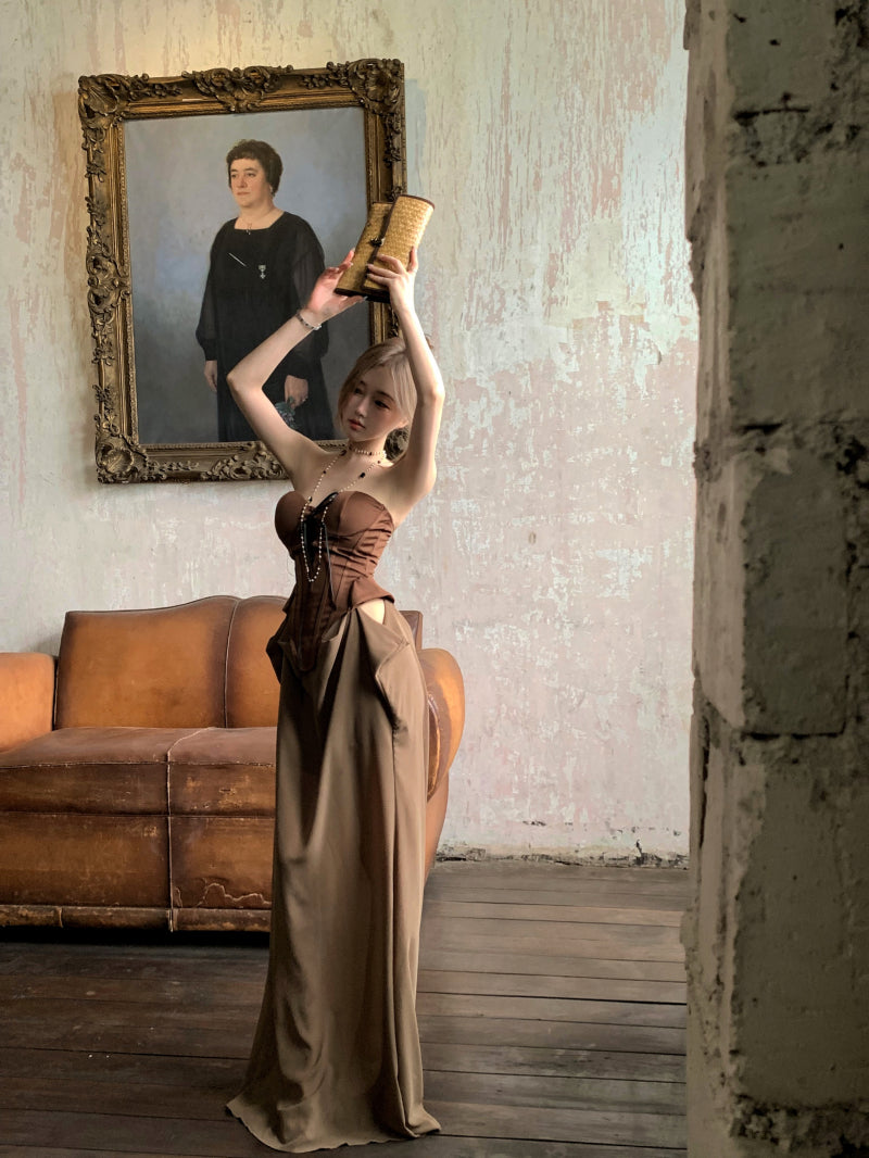 Gen Z Style Dark Corset Top Brown Strapless Maxi Skirt Vintage Formal Gatherings Ruched Waist Long Dress AP2079
