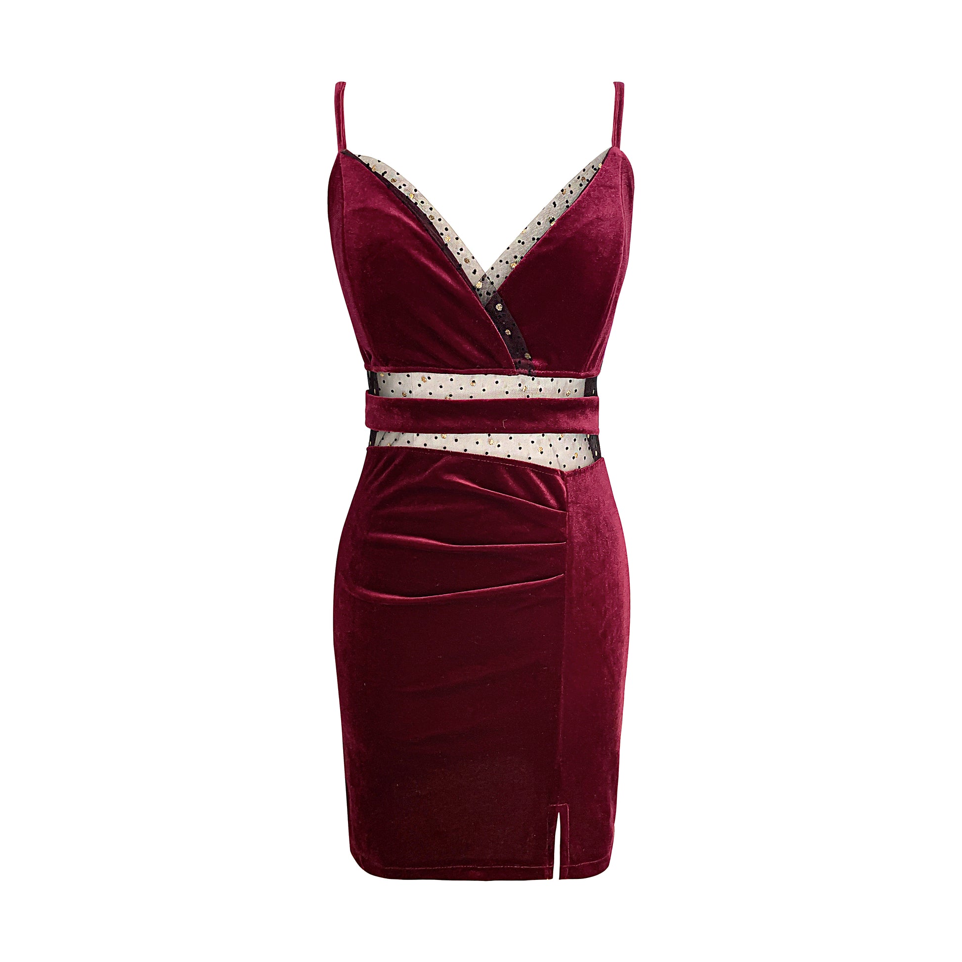 Charming Burgundy Velvet Cutout Spaghetti Strap Mini Skirt Sexy Parties Outfit Blace Mesh Trimmed Sequins Design Zipper Back Short Dress AP1690