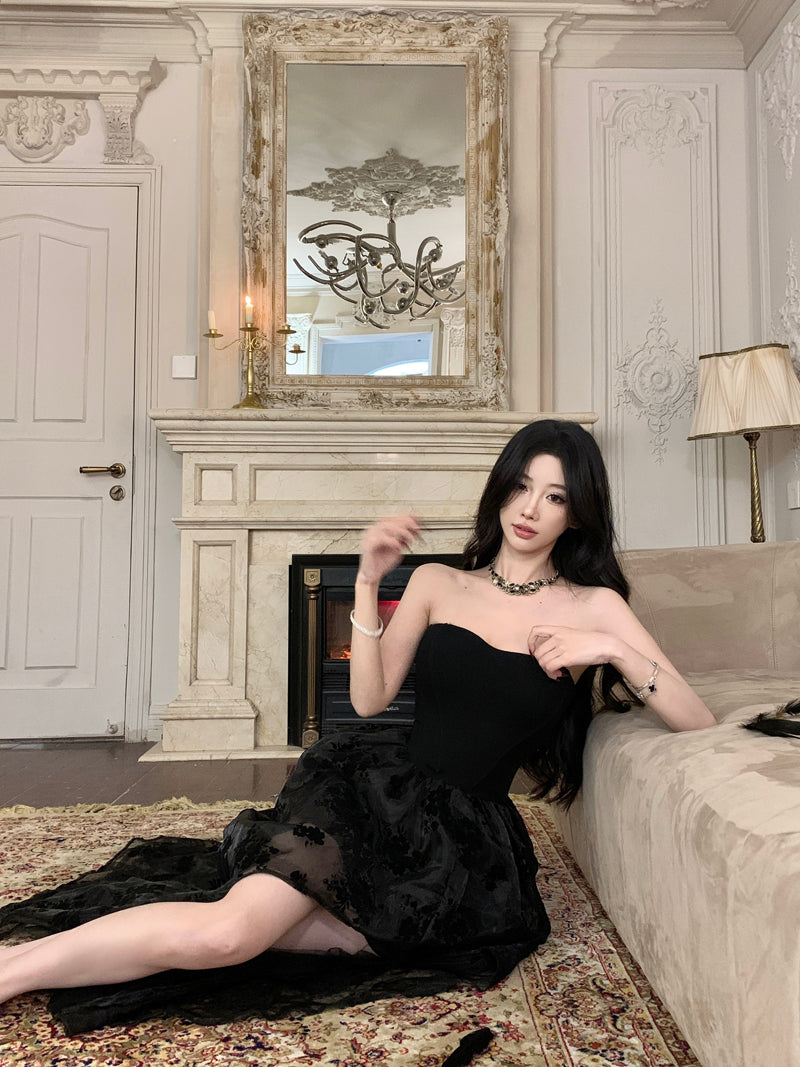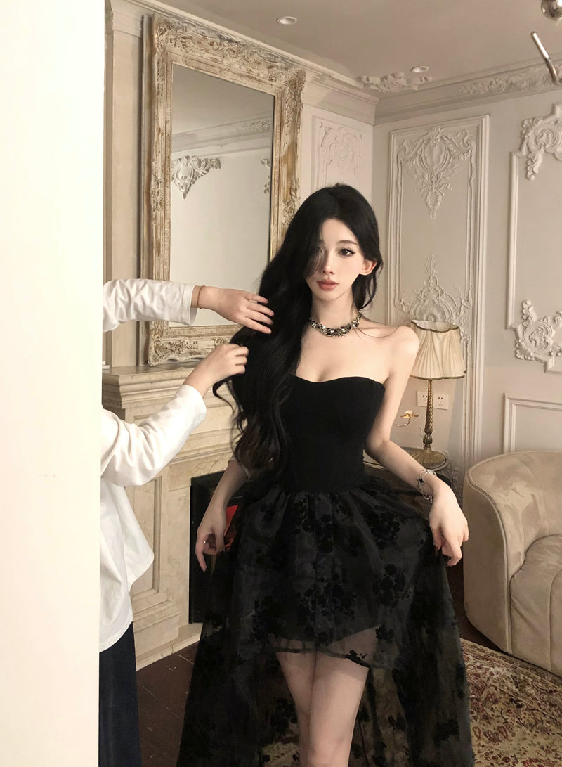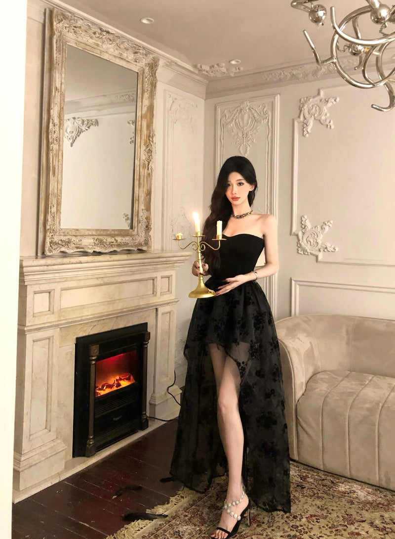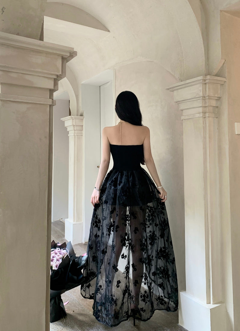 Gothic-Inspired Black Strapless High-Low Hem Maxi Dress Charming Embroidered Tulle Overlay Long Dress AP1768