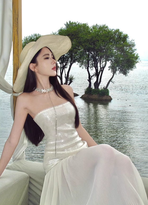 Glam Resort Outfit Sequin Glittering Maxi Dress Flowy Sheer Tulle Splicing Strapless Long Dress AP1170
