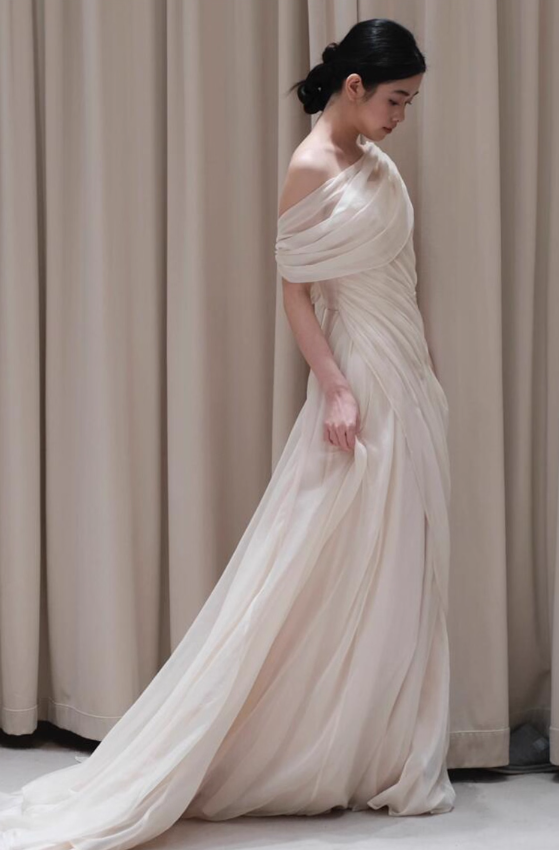 Graceful Asymmetrical One-Shoulder Tulle Layered White Evening Dress Draped Bodice Prom Dress AP0828