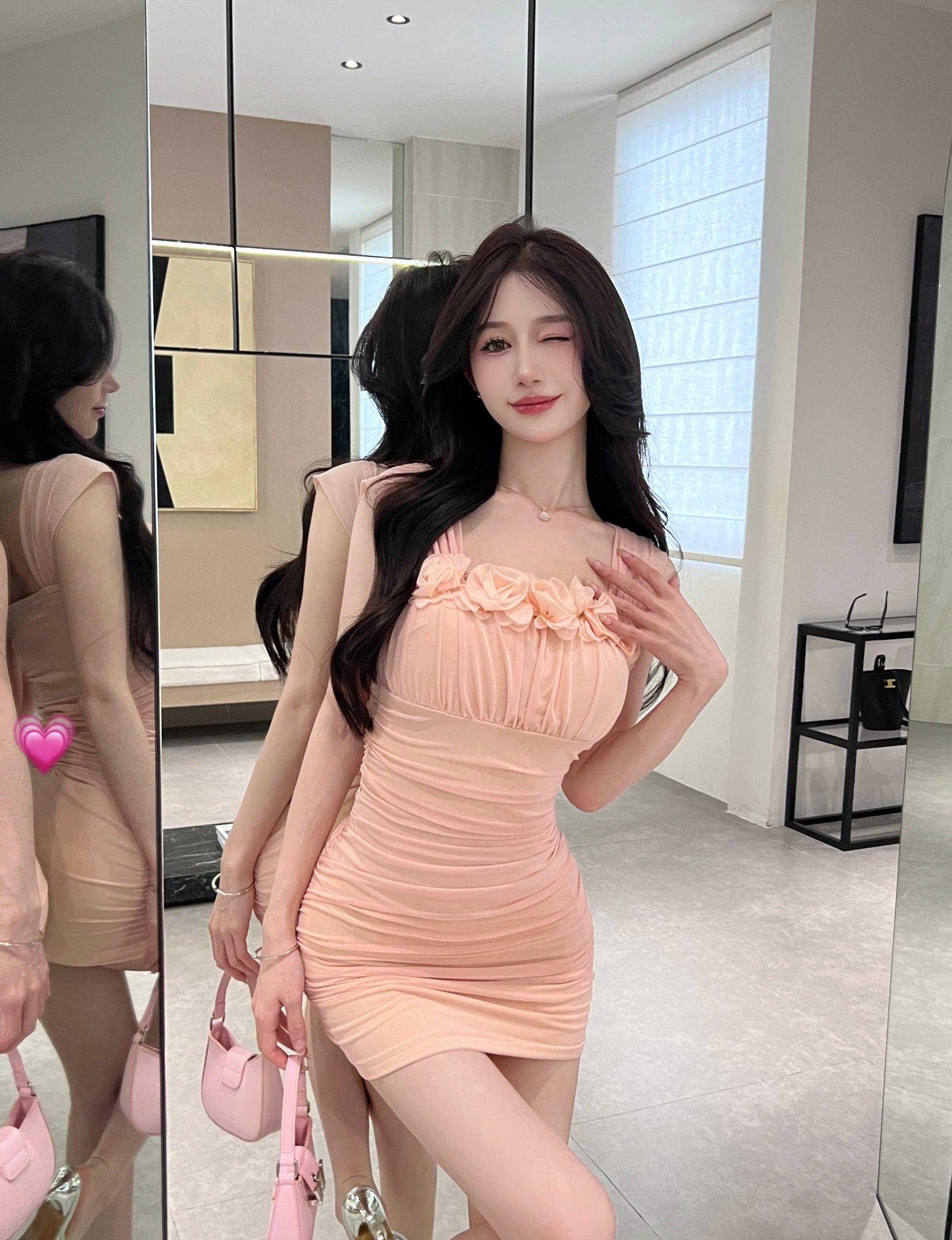 Sweet Girls 3D Flower Accent Mini Skirt Dates Outfit Ruched Bodice Draped Mesh Short Dress AP1889