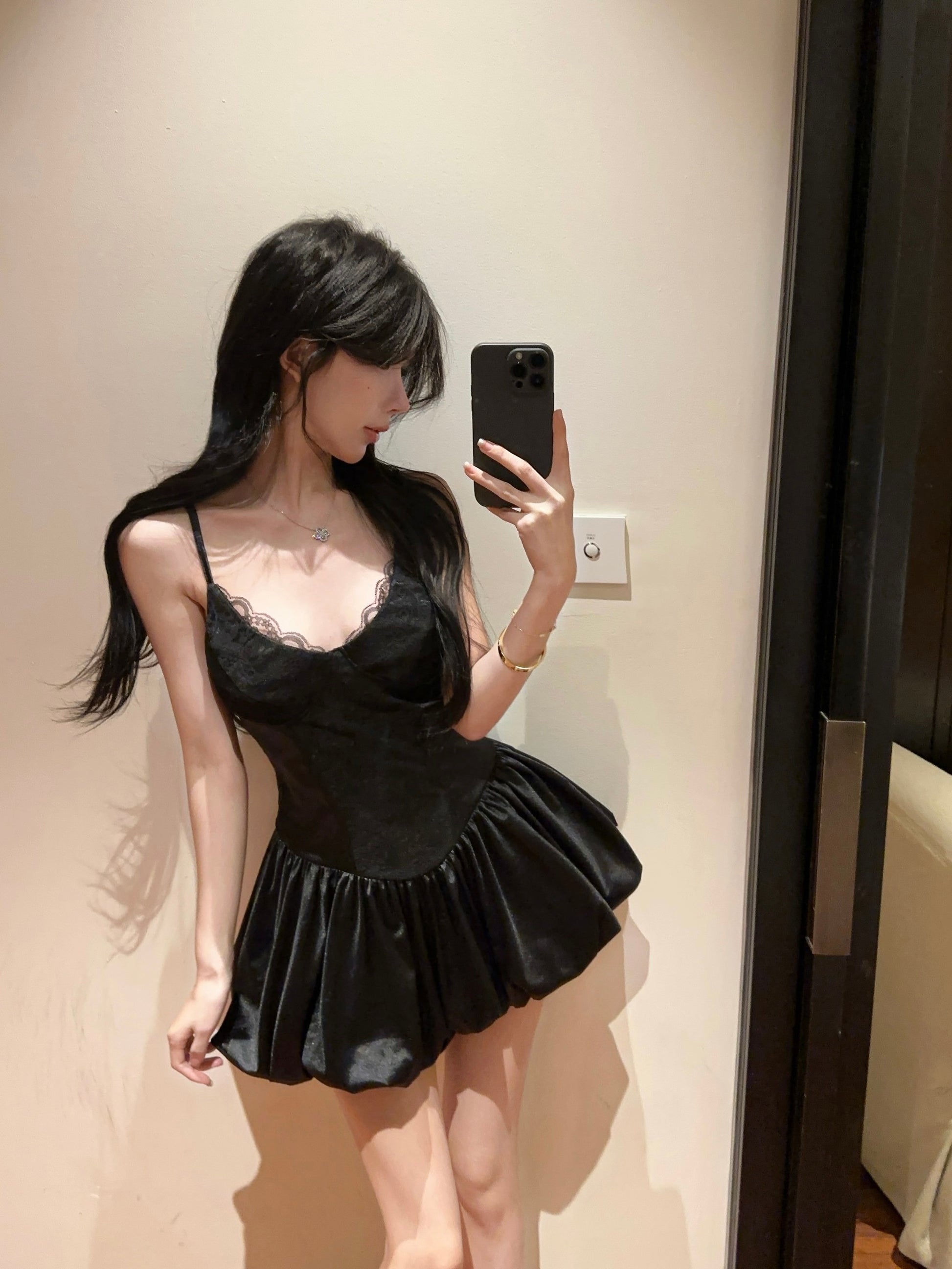 Hot Girls Black Spaghetti Strap A-Line Flared Mini Dress Parties Outfit Sexy Lace Trimmed Neckline Short Dress AP1894