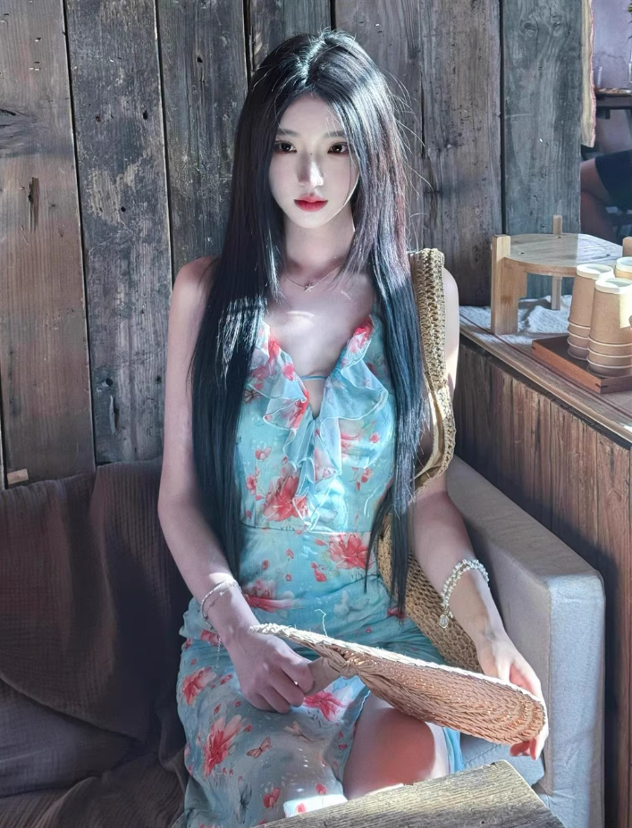 Hot Girls Floral Printed V-Neck Ruched Maxi Dress Ruffles Trimmed High-Slit Halter Dress AP1152