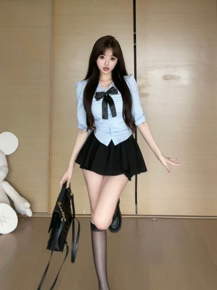 Everyday Wear 2-Piece Set Light Blue 3/4 Sleeve Mini Skirt School Theme Parties Outfit Black Bow Accent Black Pleated Short Dress AP1769