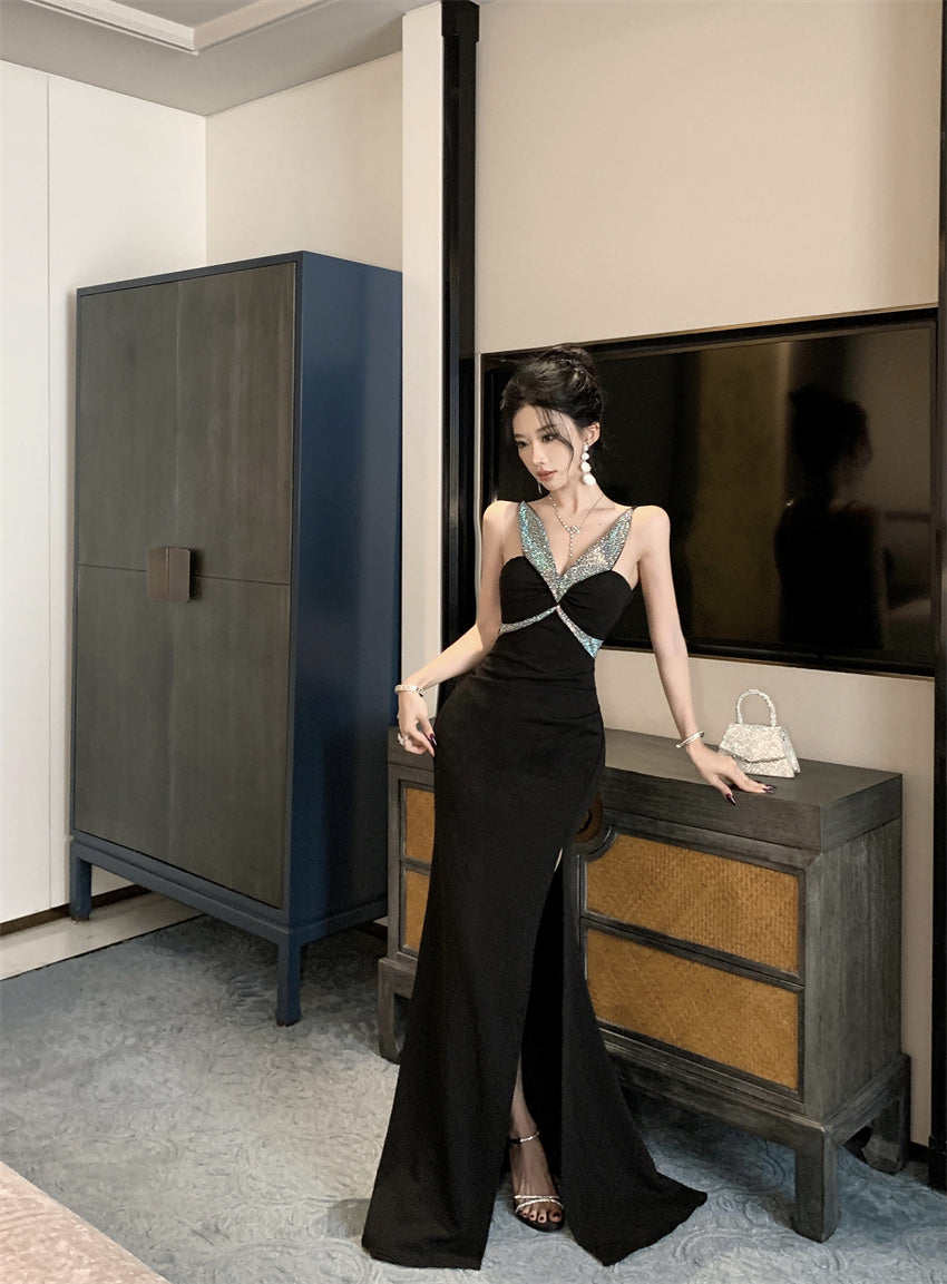 Glamorous Rhinestone Cross Strap Black Mermaid Maxi Dress Chic High Slit Luxury Parties Long Dress AP1828