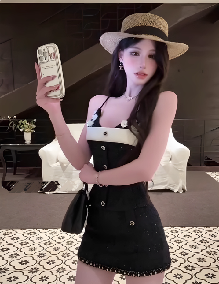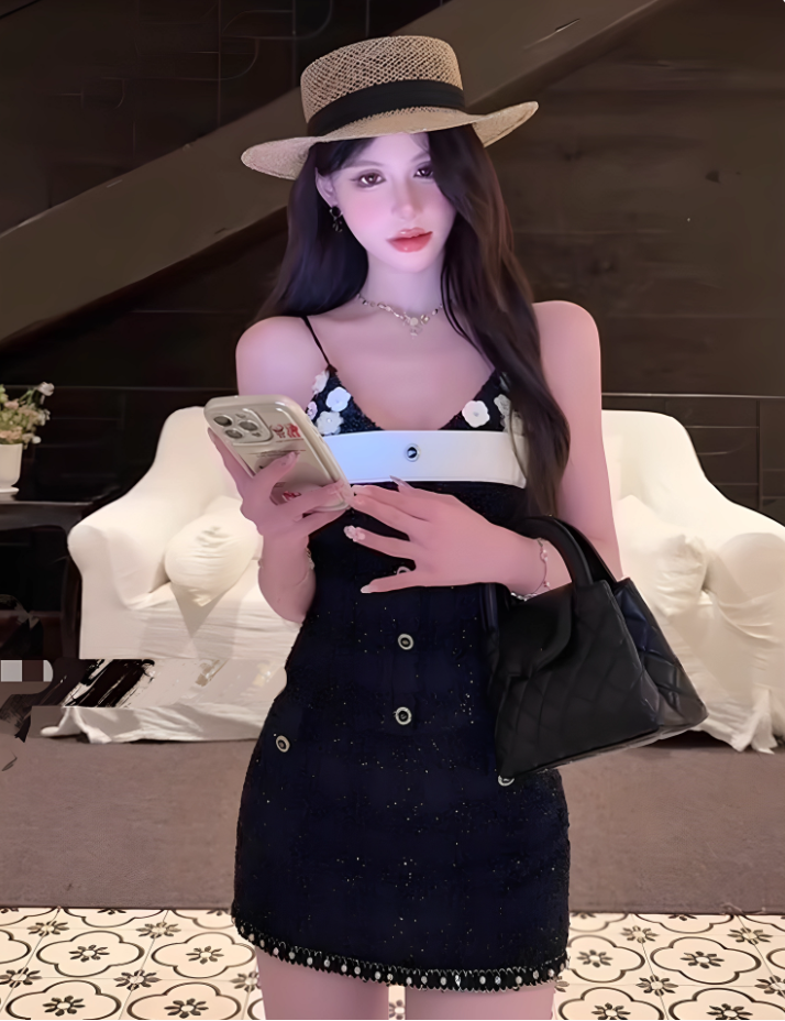 Vintage-Inspired Black & White Spaghetti Straps Mini Dress Hot Girls Floral Accents Button Details Short Dress AP1853