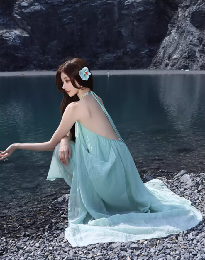 Ethereal Lightweight Ruffles Hem Maxi Dress Niche Flowy Asymmetric Hem Backless Halter Long Dress AP1380