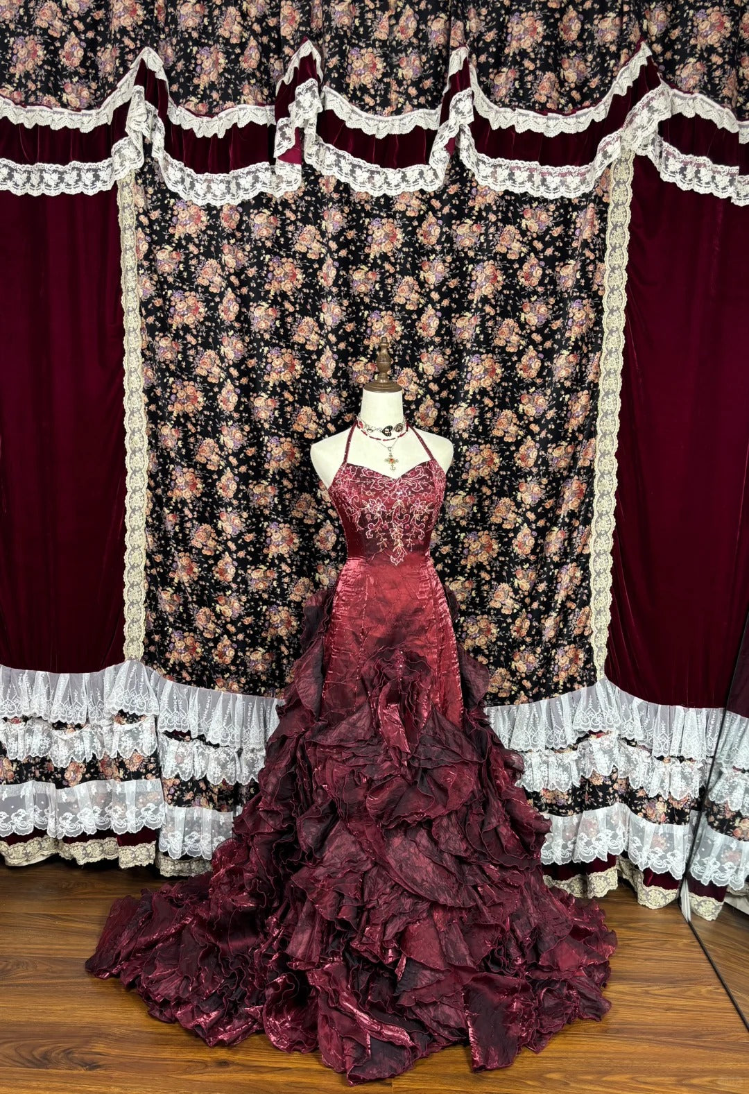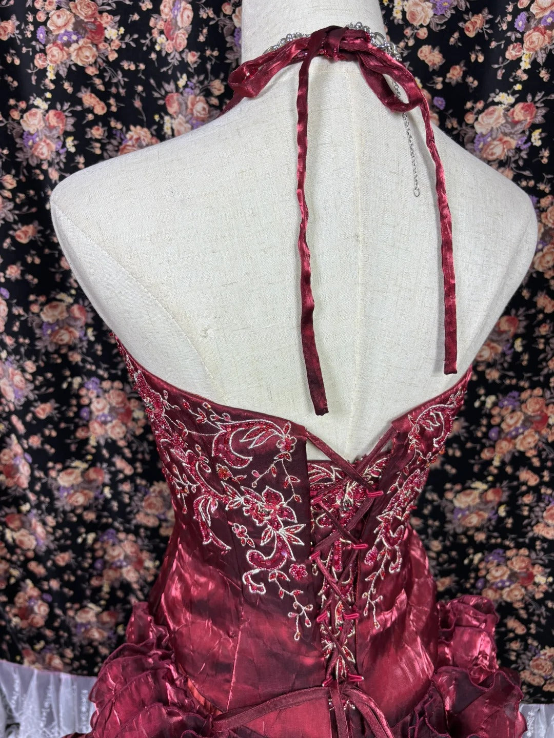 Unique Halter Neck A-Line Ruffled Evening Gowns Beaded Sequins Red Prom Dress AP2556