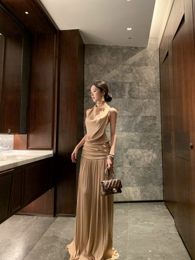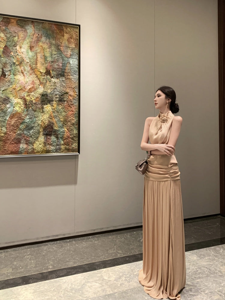 Gorgeous Sleeveless Halter Neck A-Line Maxi Dress 3D Flower Backless Pleated Long Dress AP3318