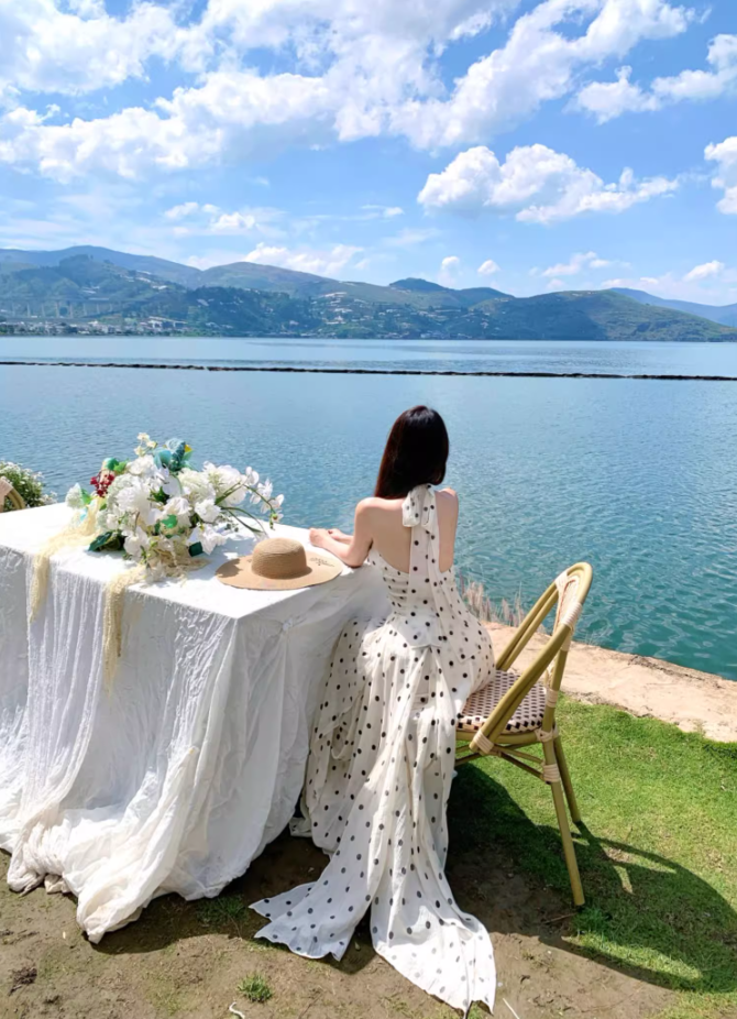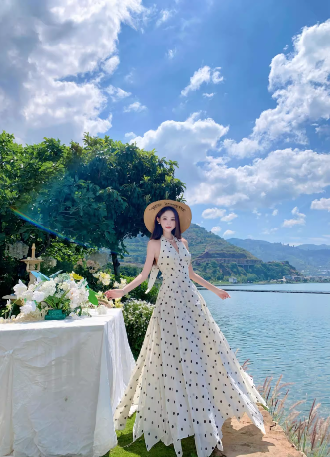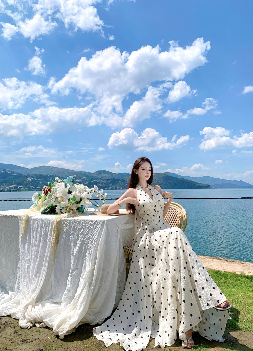Vogue Halter Neck A-Line Maxi Dress Chic Polka Dots Asymmetric Hem Long Dress AP3322