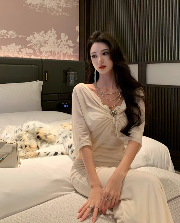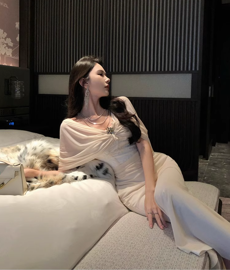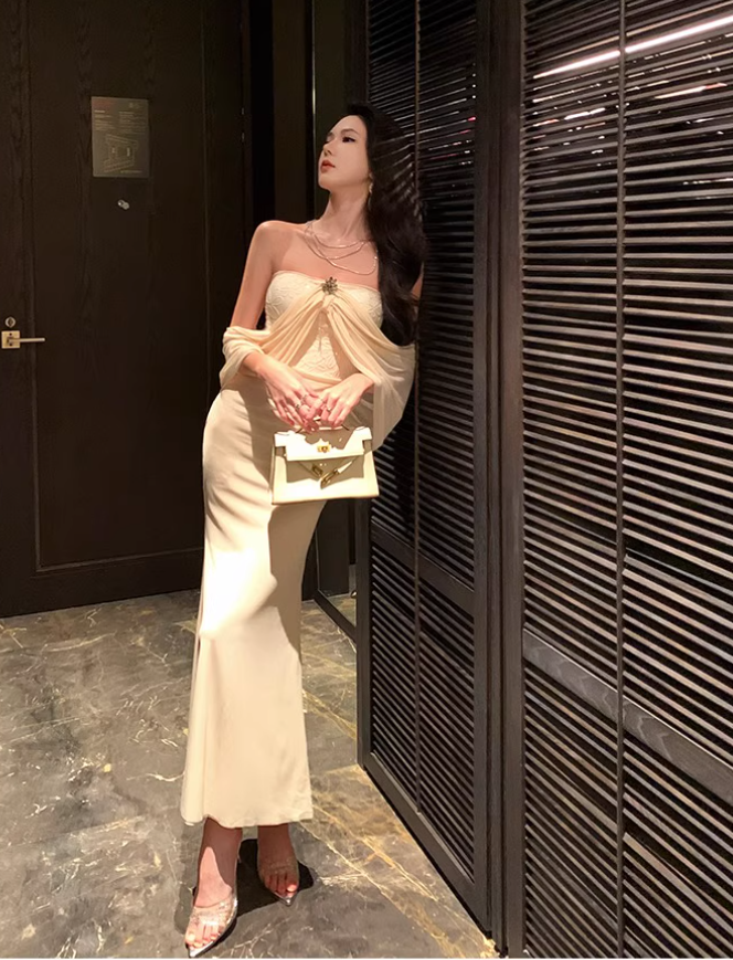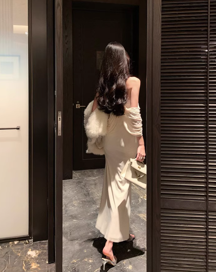 French-Inspired Off-Shoulder Shawl Strapless Maxi Dress Soft Fabric Bodycon Long Dress AP0606
