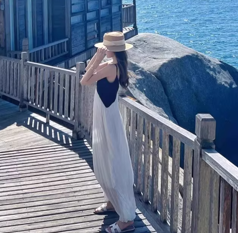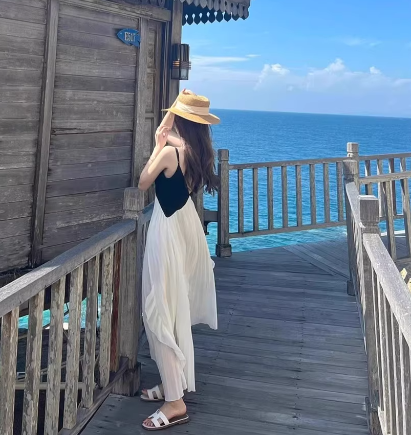 Shirred Tulle White-Black Splicing V Neck Brightening Dress Spaghetti Strap Vacation Long Dress AP0420