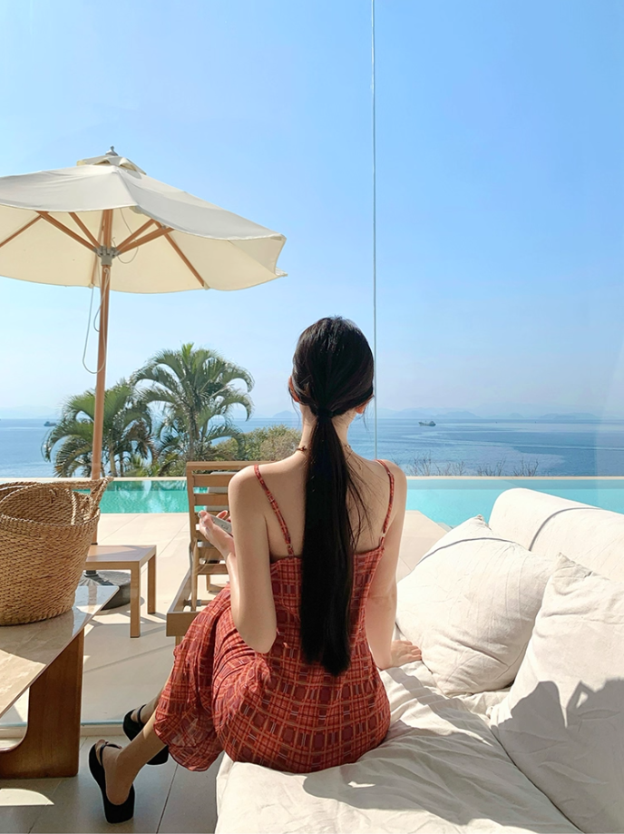 Plaid Print Brightening Maxi Dress Hollow-Out Spaghetti Strap Vacation Long Dress AP0433