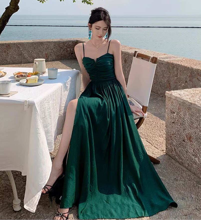 Elegant High-Slit Ethereal Draped Dress Brightening Spaghetti Strap Seaside Vacation Long Dress AP0434