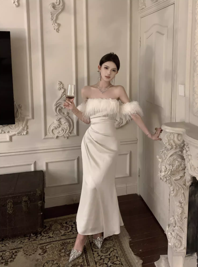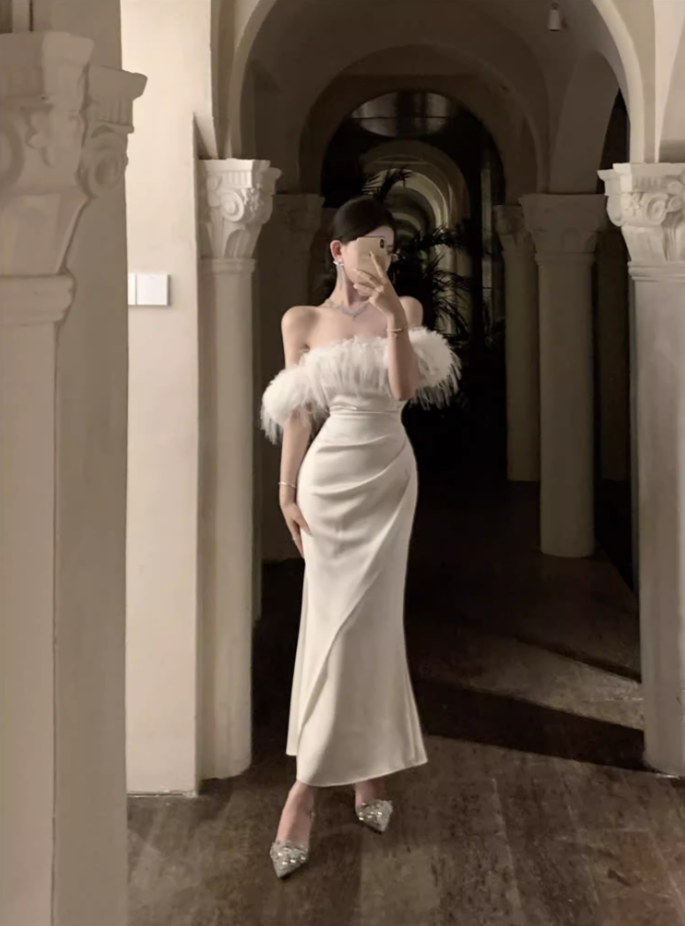 French Style White Lace-Up Mermaid Long Dress Romantic Off-Shoulder Feather Trim Evening Long Dress AP3572