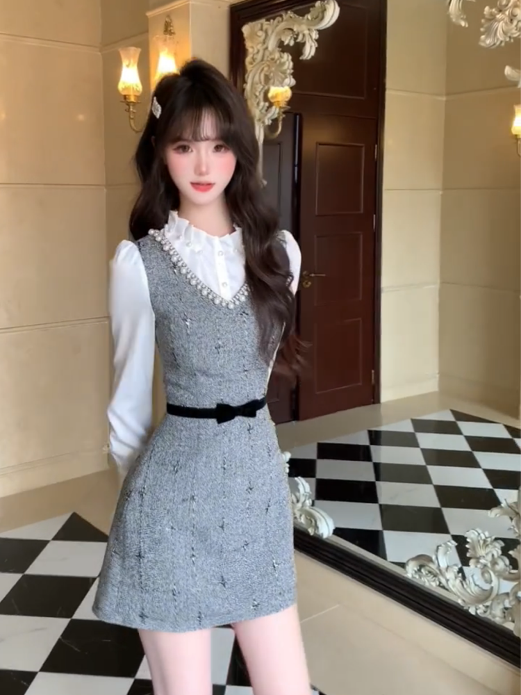 Sexy Jewel Neck Cinched-Waist Long Sleeve Mini Skirt Glamorous 2-Piece Set A-Line Short Dress AP3989