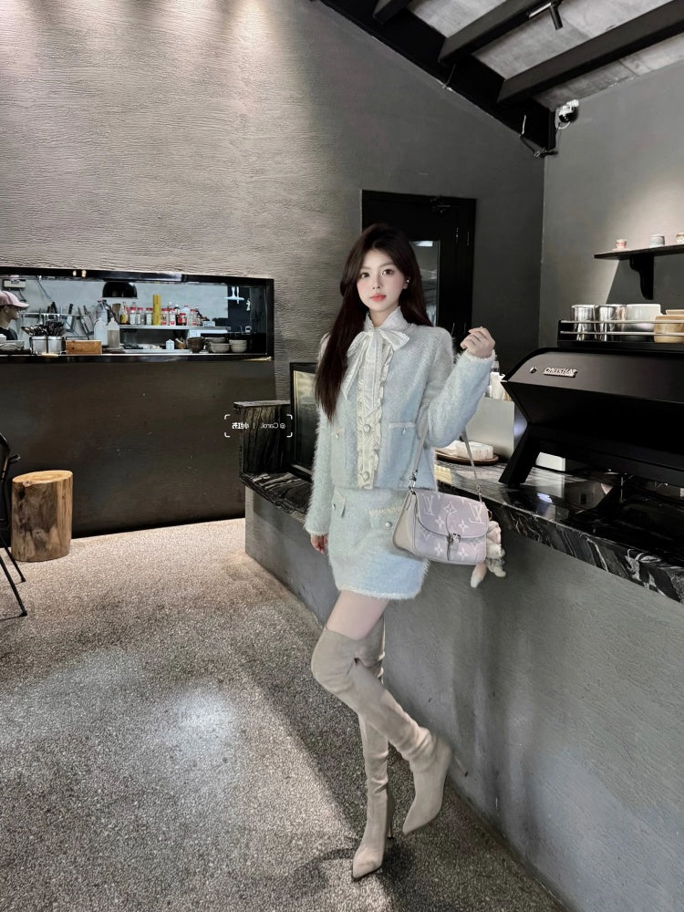Lovely Long Sleeve Jewel Neck Mini Skirt With Pocket Furry Sheath 2-Piece Set Short Dress AP4008