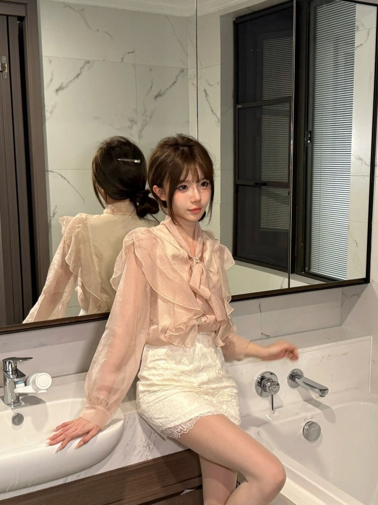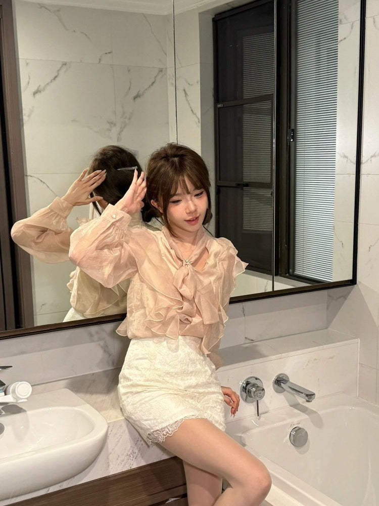 Casual Long Sleeve V Neck Ruffles Mini Skirt Playful Sheath 2-Piece Set Short Dress AP4001