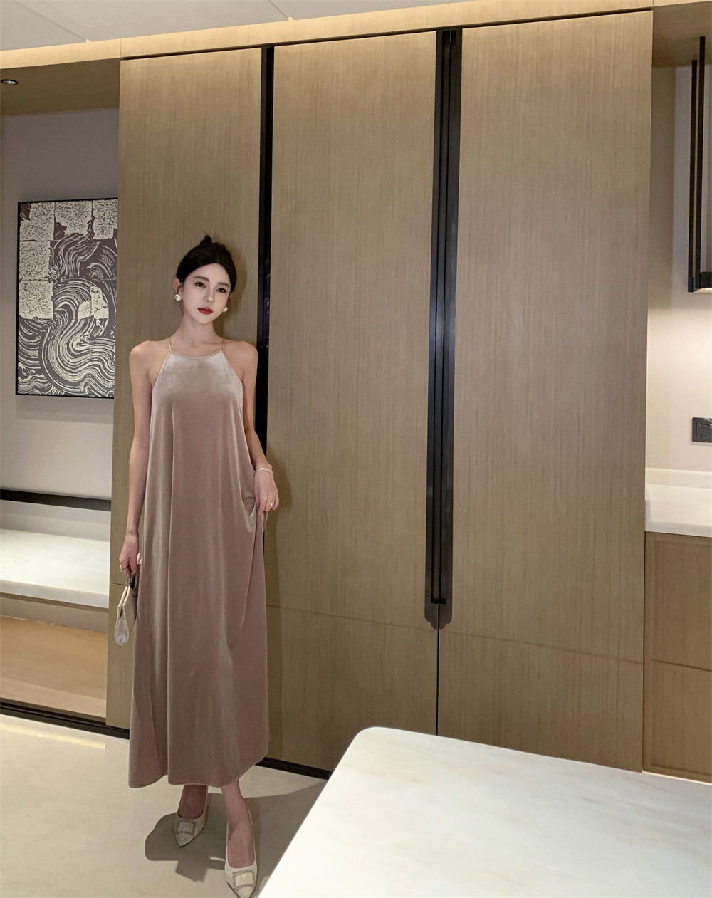 Charming Velvet Loose Fit Evening Maxi Dress Casual A-Line Flowy Hem Slit Halter Long Dress AP3568