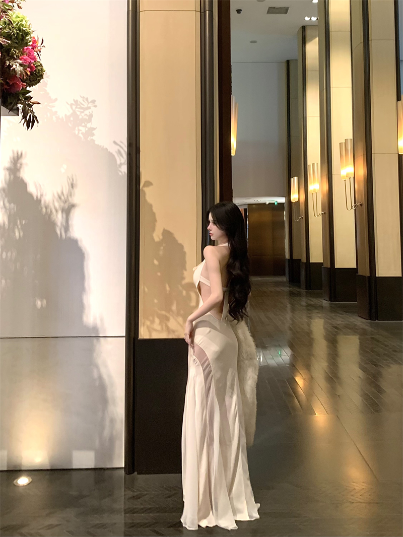 Gen Z Style Mermaid White Maxi Dress Vogue Tulle Splicing Draped Neckline Halter Long Dress AP3478