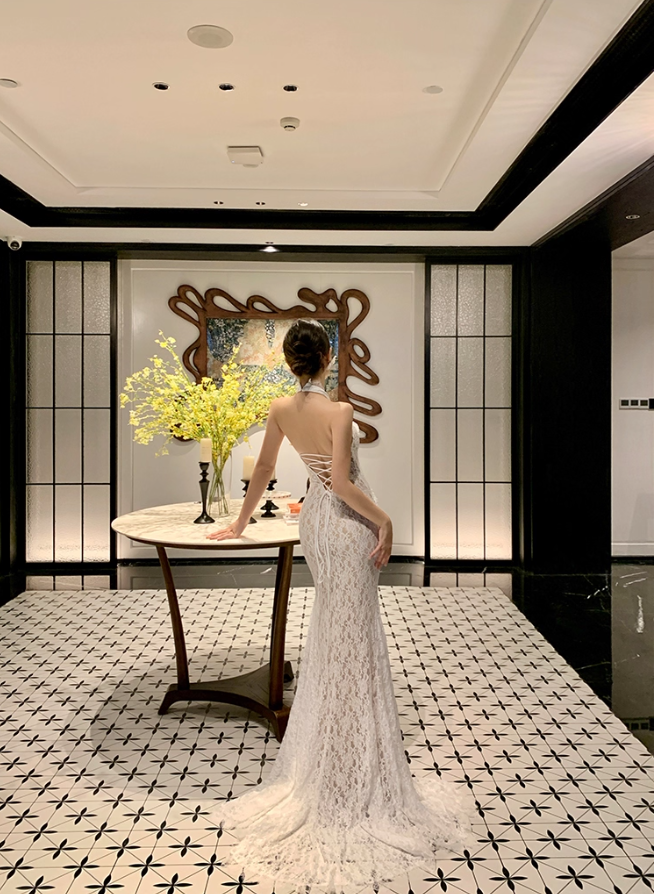 Trendy Mermaid White Lace Splicing Maxi Dress Romantic Backless Lace-Up Long Train Halter Long Dress AP3784