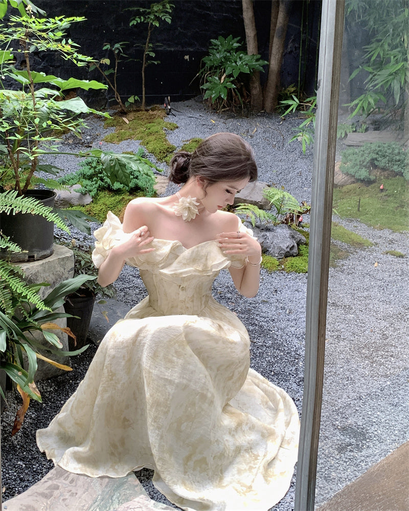 French-Inspired Off-Shoulder Ruffles Neckline Maxi Dress Fashionable Floral Print Cinched-Wasit Long Dress AP1871