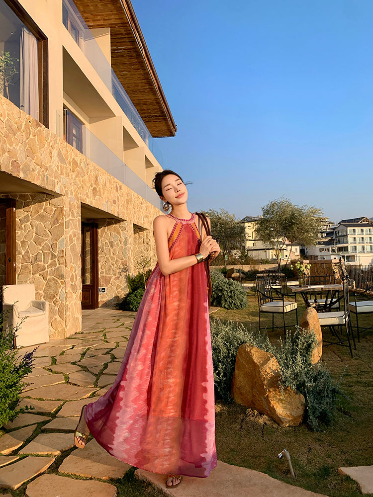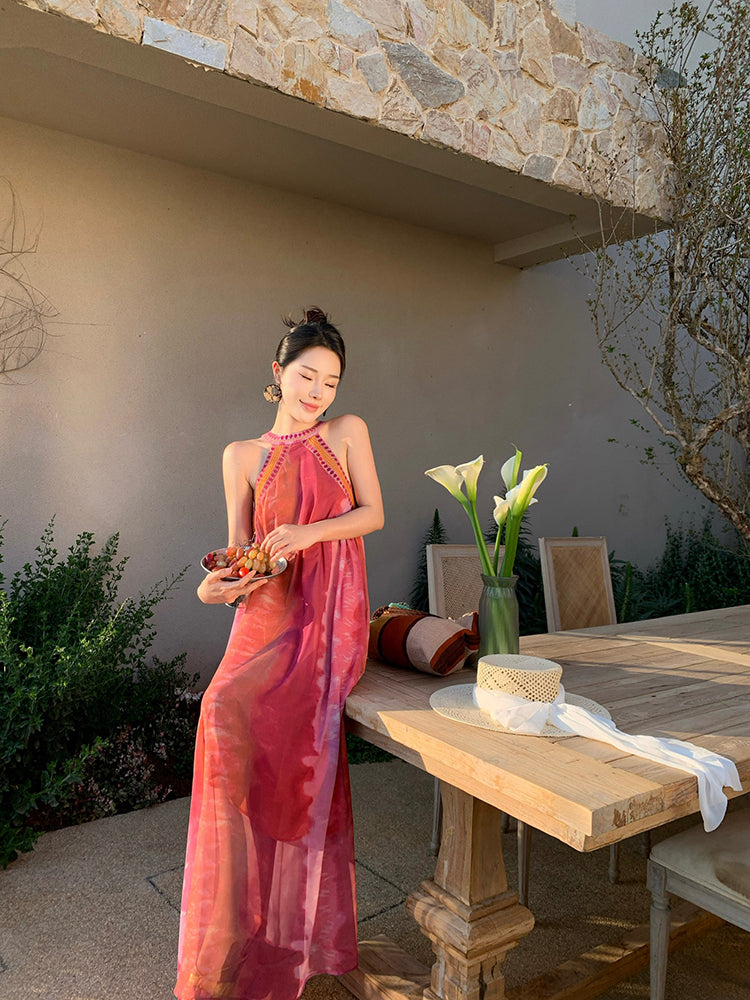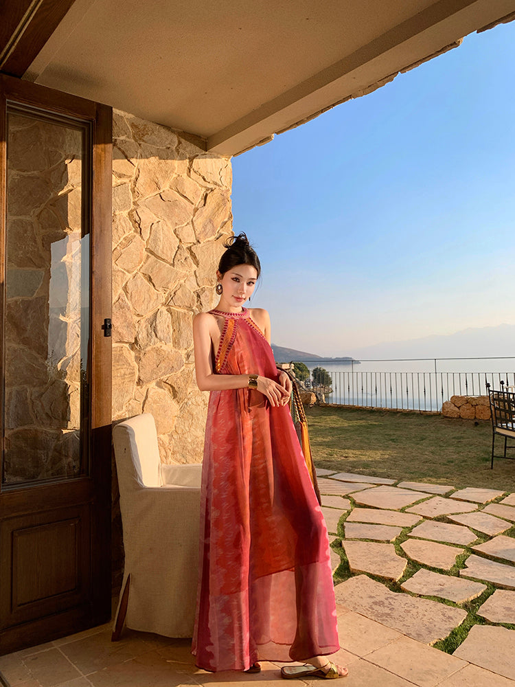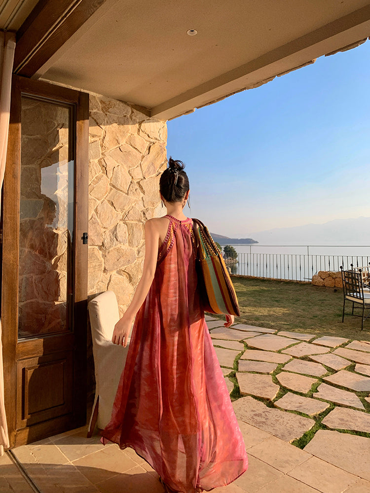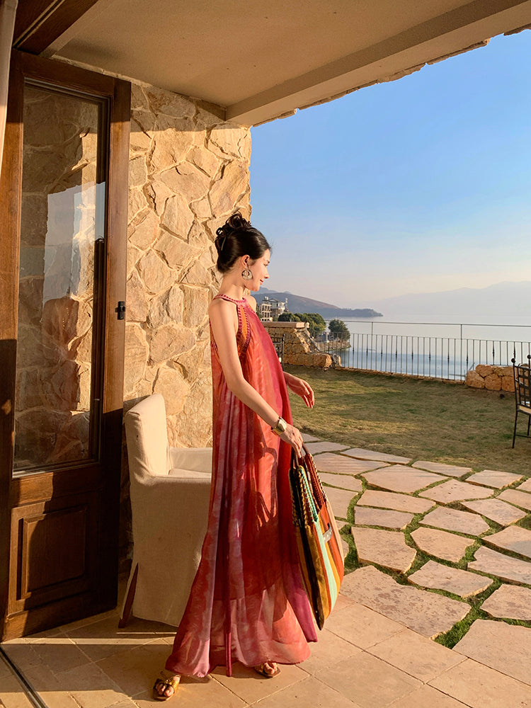Simple Jewel Neck Sleeveless Maxi Dresses Boho-Style A-Line Flowy Tie-Dye Sequins Long Dress AP3432