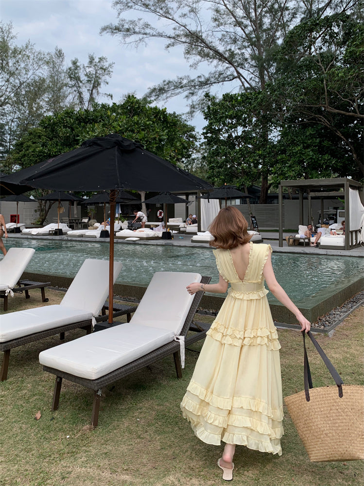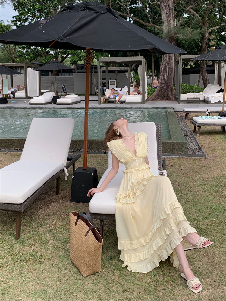 Graceful Ruffles A-Line Maxi Dresses Playful Deep V Neck Sleeveless Cinched-Waist Long Dress AP3453