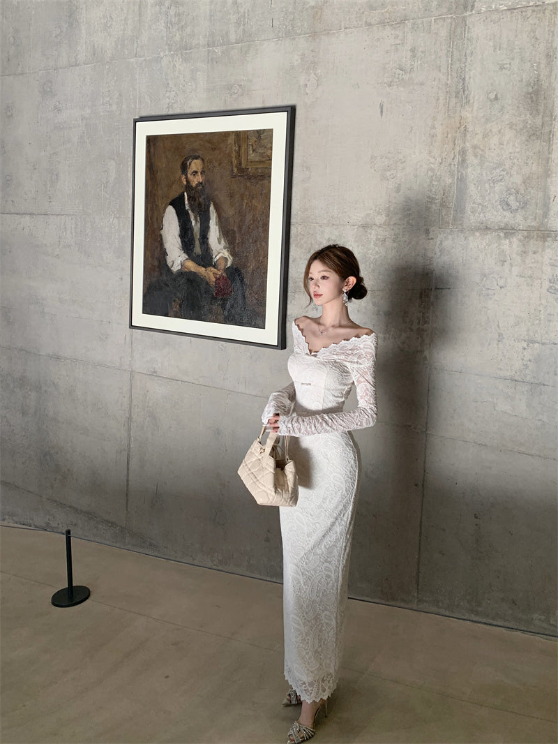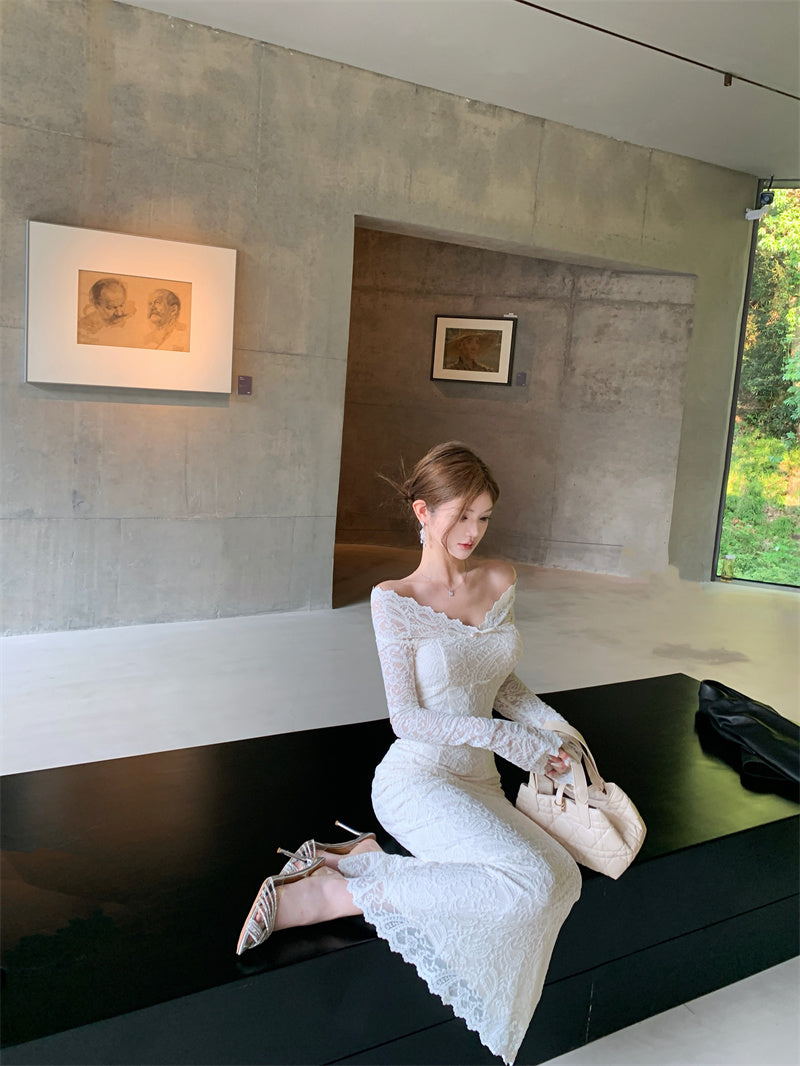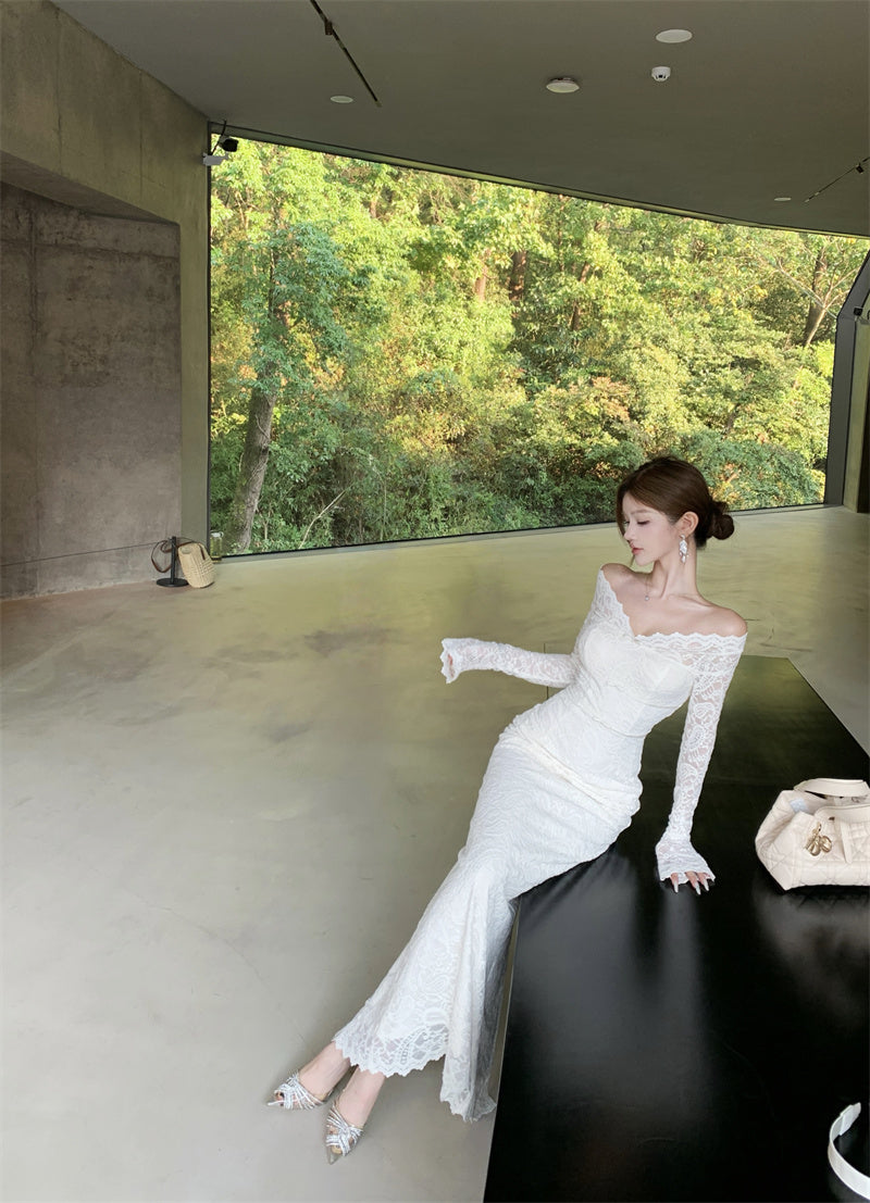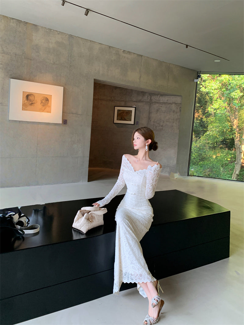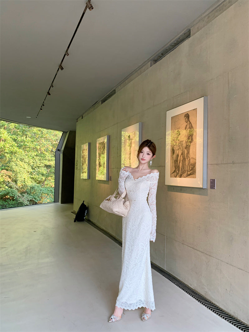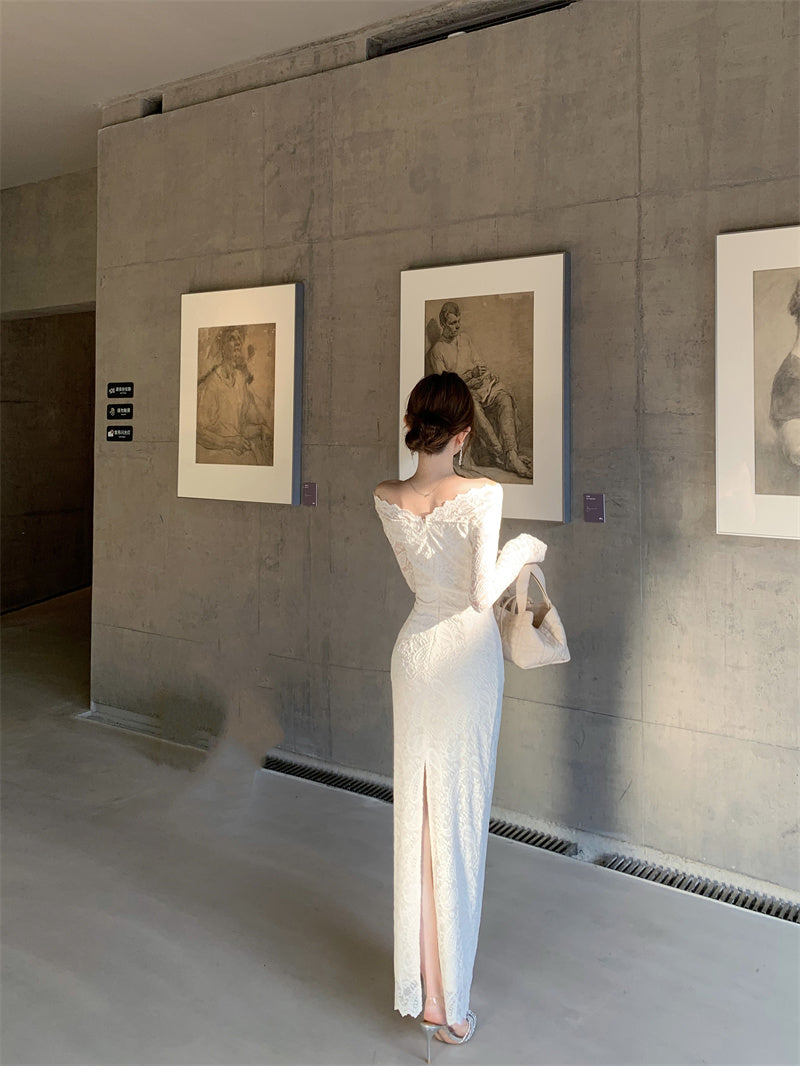 French Style V-Neck Sheath Maxi Skirt Lace Back Slit Long Sleeve Long Dress AP3282