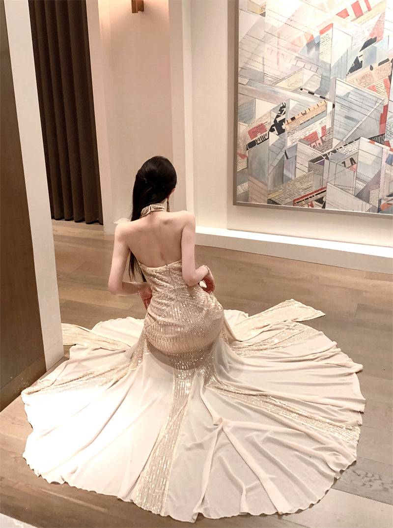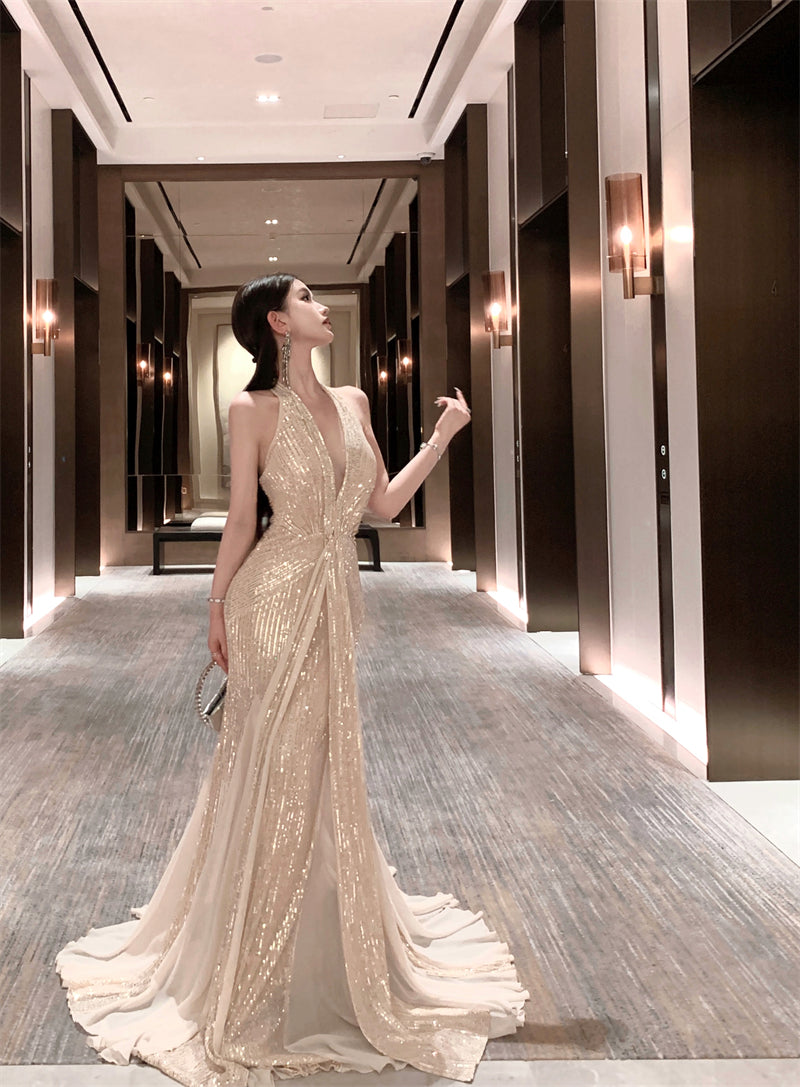Maximalism Mermaid Tulle Splicing Maxi Dress Stunning Sequins Accent Deep V-Neck Evening Halter Long Dress AP3481